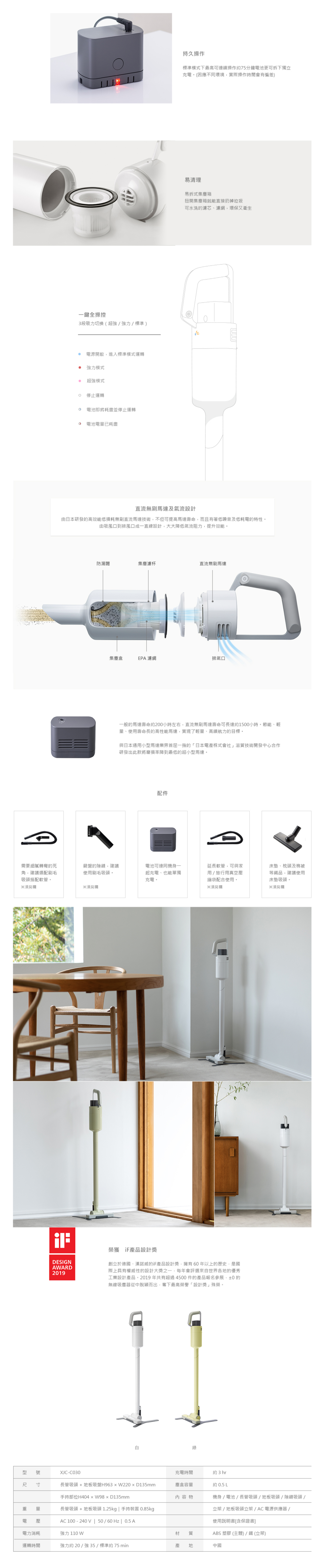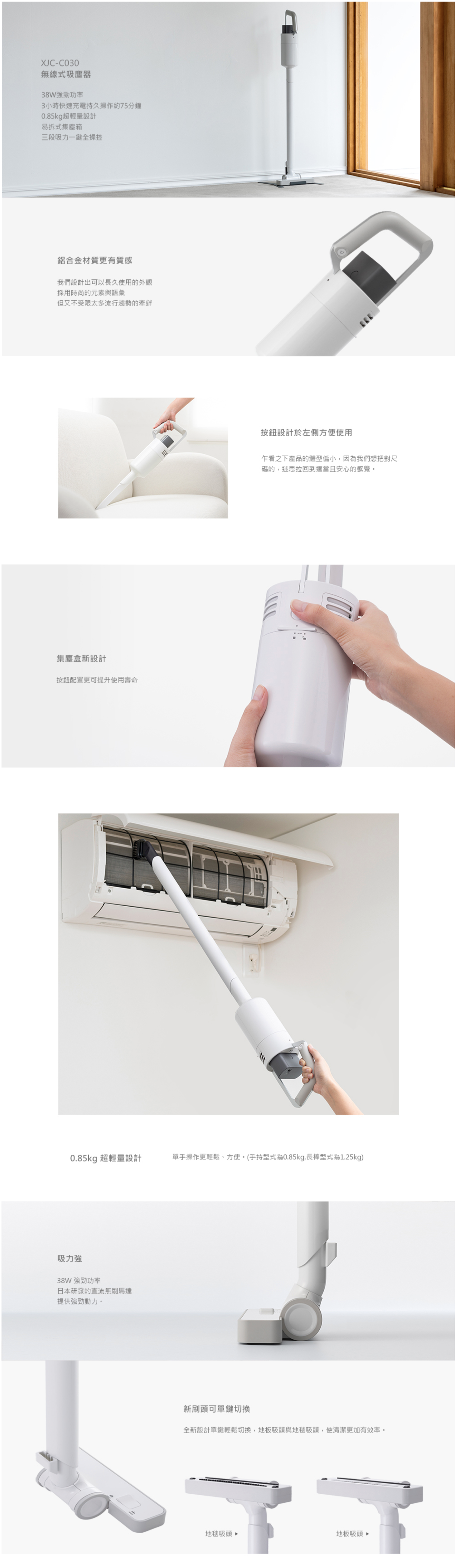 新一代全新再進化! 單機0.85kg更輕巧設計 直流馬達吸力提升約53% 續航力高達75分鐘 電池可拆下充電 地板吸頭升級增大 新增地毯毛刷頭可自由開啟 長按電源鍵可直接關機