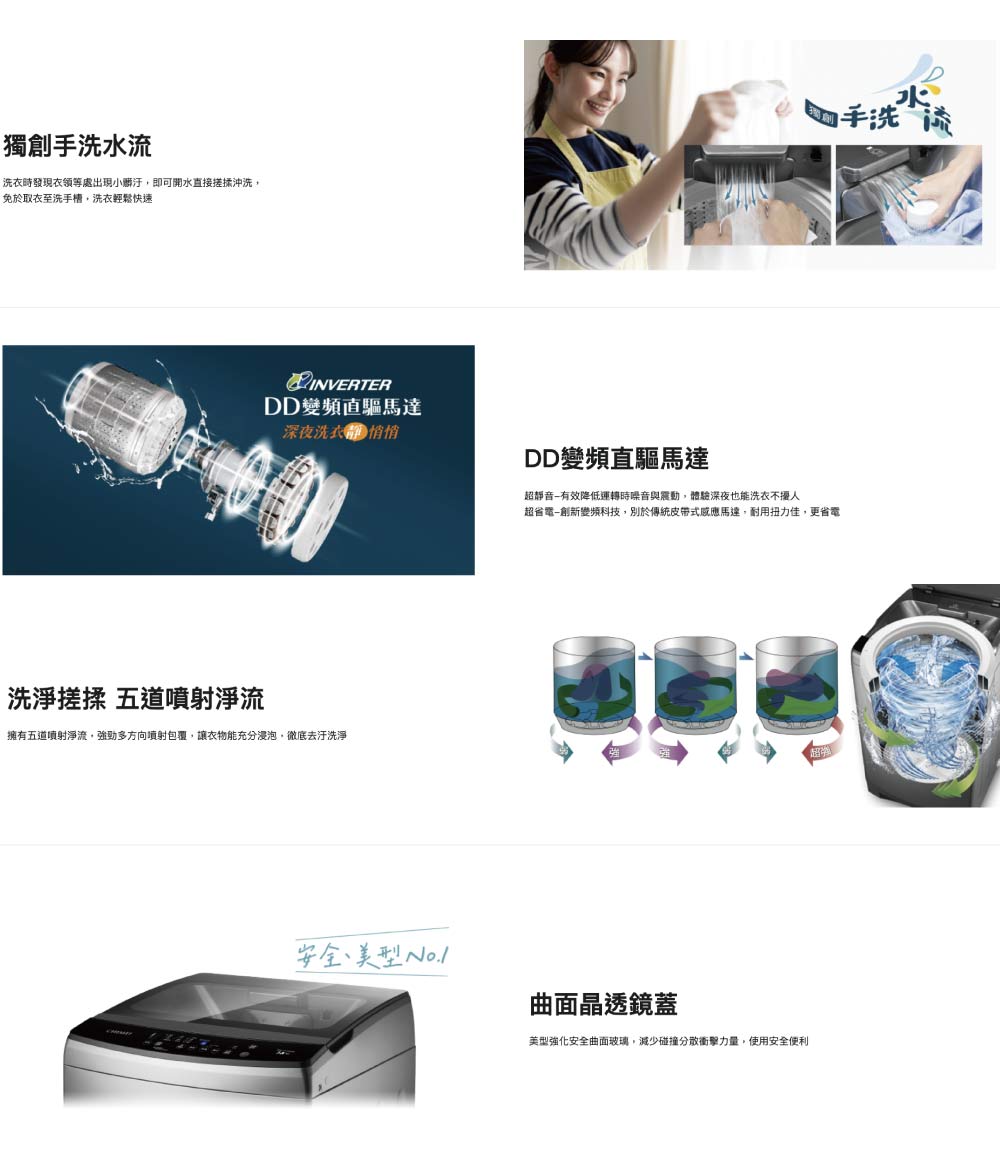 DD變頻直驅馬達 / 獨創手洗水流 內桶不鏽鋼 / 曲面晶透鏡蓋 槽洗淨 / 緩降晶透鏡蓋 / 防鼠底座