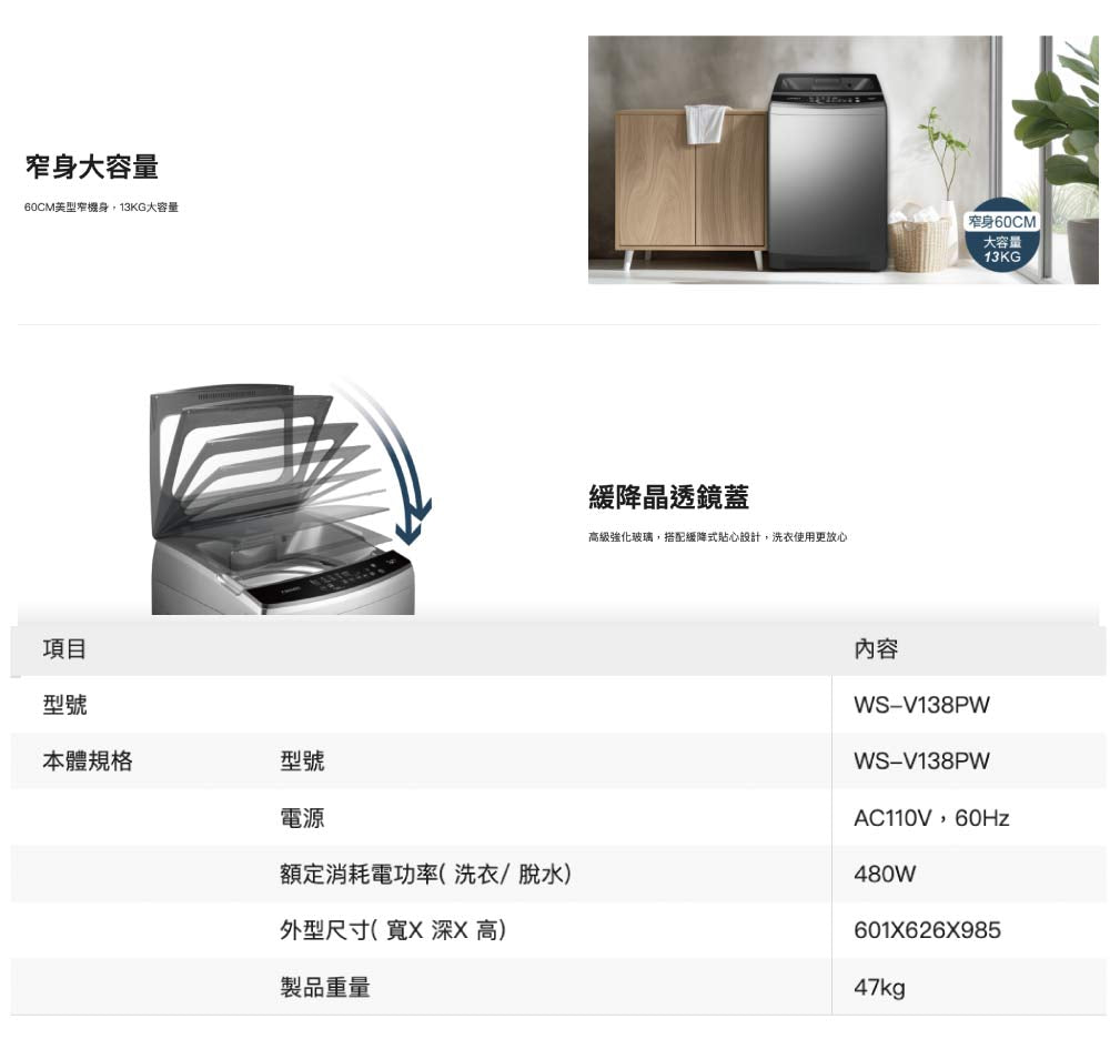 奇美CHIMEI|13kg 變頻直立式洗衣機 WS-V138PW