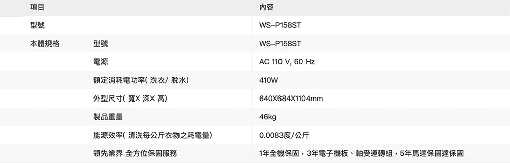 奇美CHIMEI|15kg 定頻直立式洗衣機 WS-P158ST