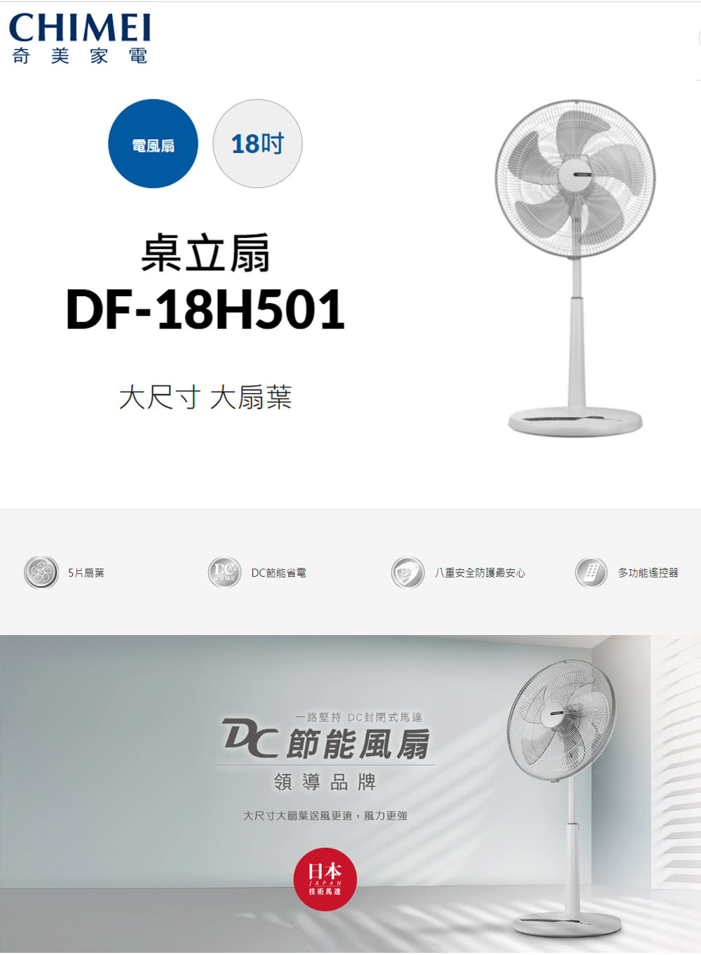 奇美CHIMEI|DF-18H501 18吋 DC節能遙控電風扇