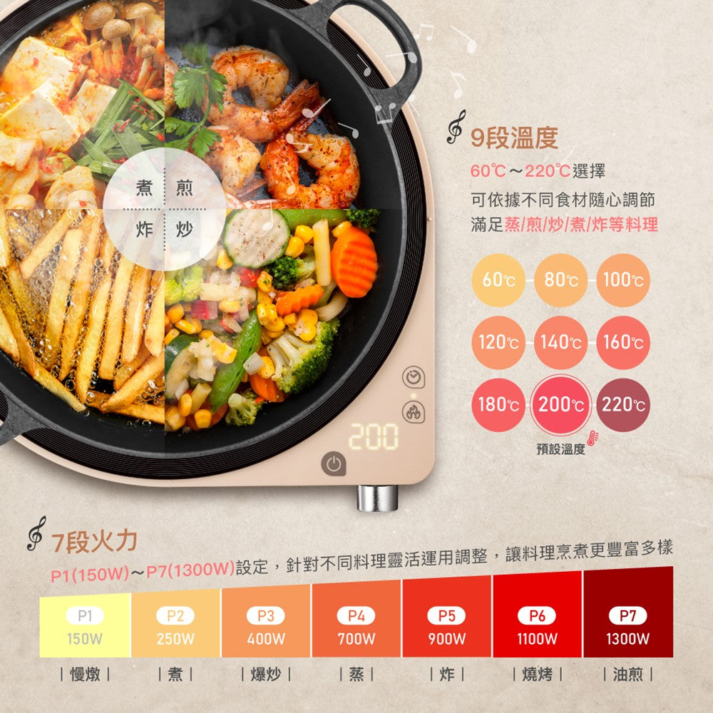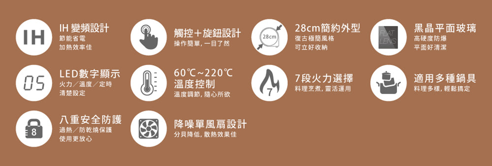 ◆25cm極簡美型設計 ◆IH變頻節能省電 ◆7段火力調節,操作簡易 ◆適用多種鍋具 ◆8重安全防護