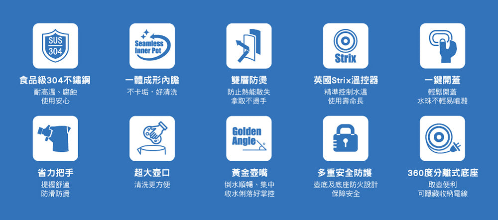 304不鏽鋼無縫內膽 雙層防燙,拿取不燙手 黃金角度壺嘴,收水俐落