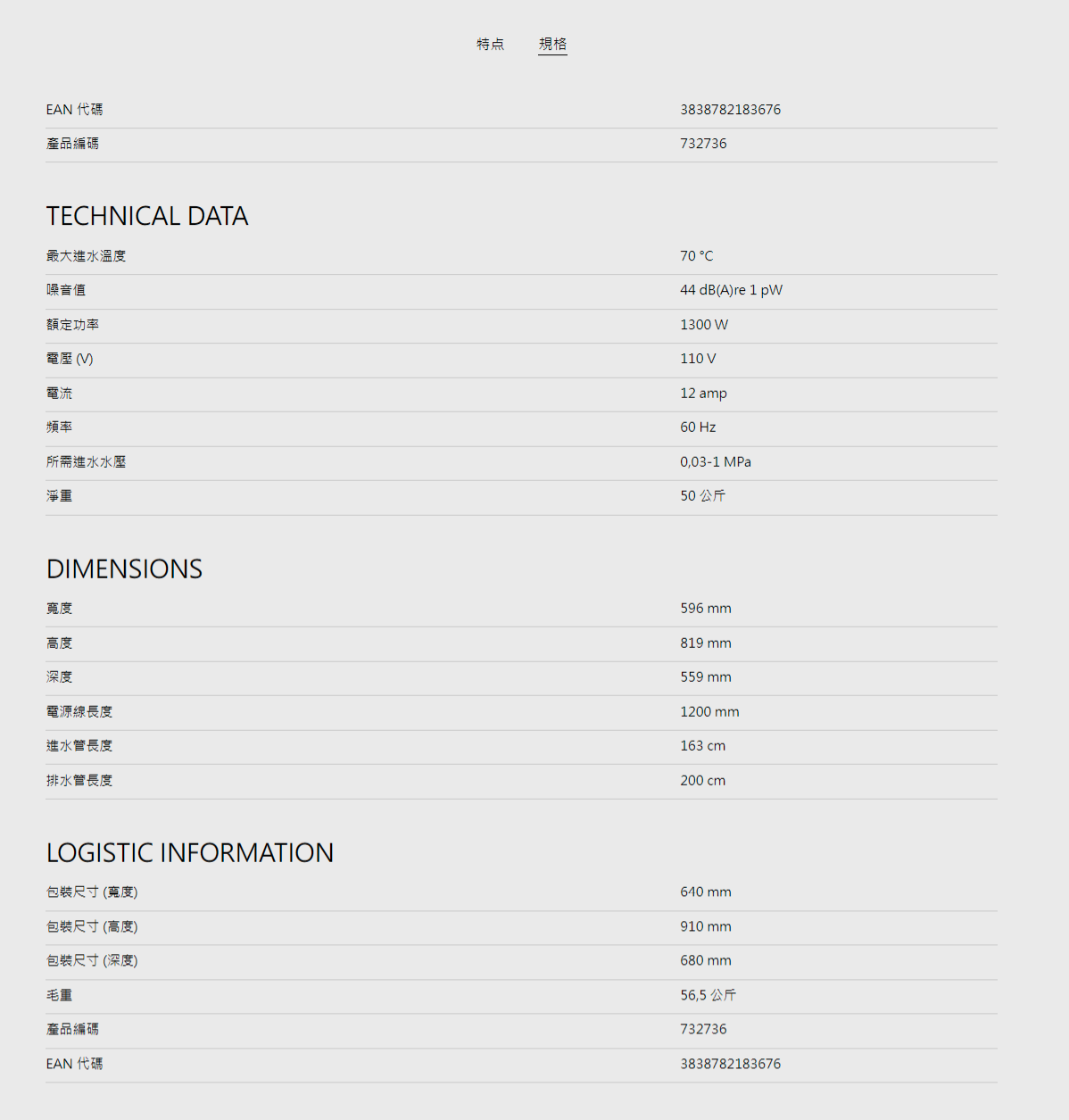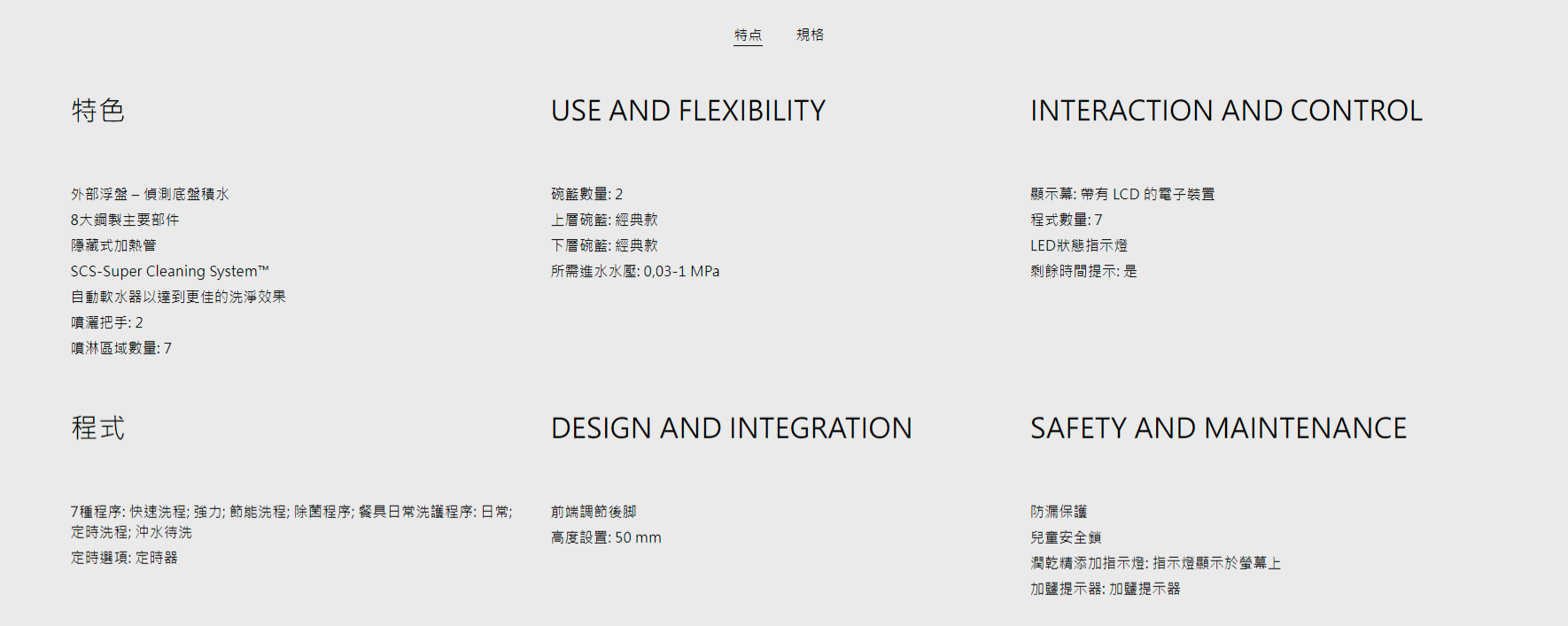 外部浮盤 – 偵測底盤積水 8大鋼製主要部件 隱藏式加熱管 SCS-Super Cleaning System™ 自動軟水器以達到更佳的洗淨效果 噴灑把手: 2 噴淋區域數量: 7