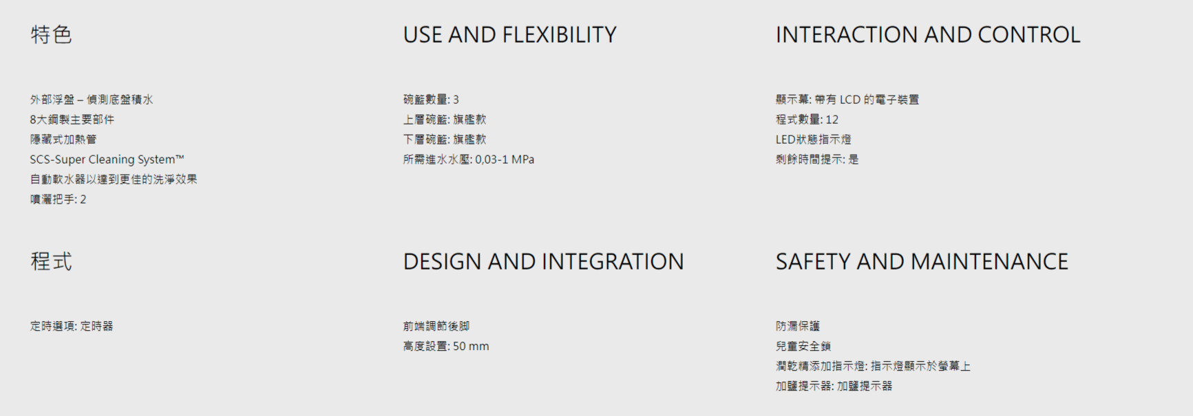 *8大鋼製主要部件 *隱藏式加熱管 *SCS-Super Cleaning System™ *自動軟水器以達到更佳的洗淨效果 *噴灑把手: 2 *噴淋區域數量: 9