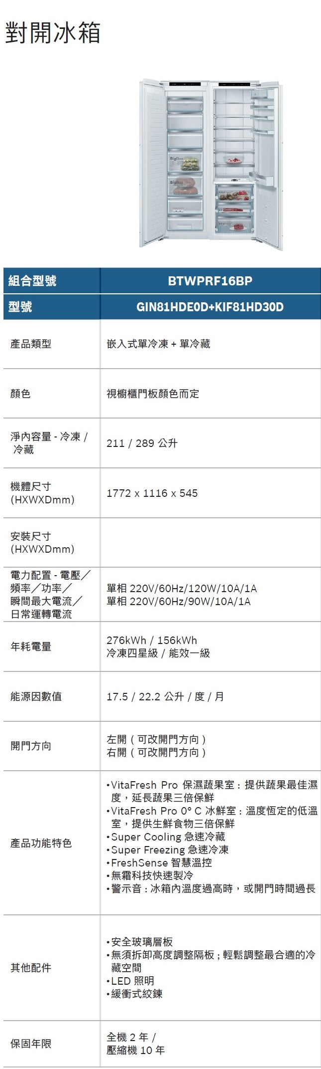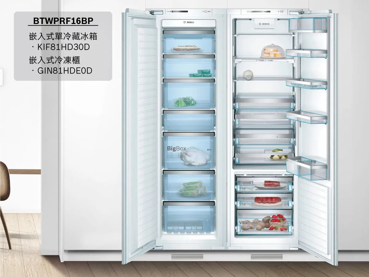 BOSCH博世|BTWPRF16BP 嵌入式雙門對開冰箱 220v
