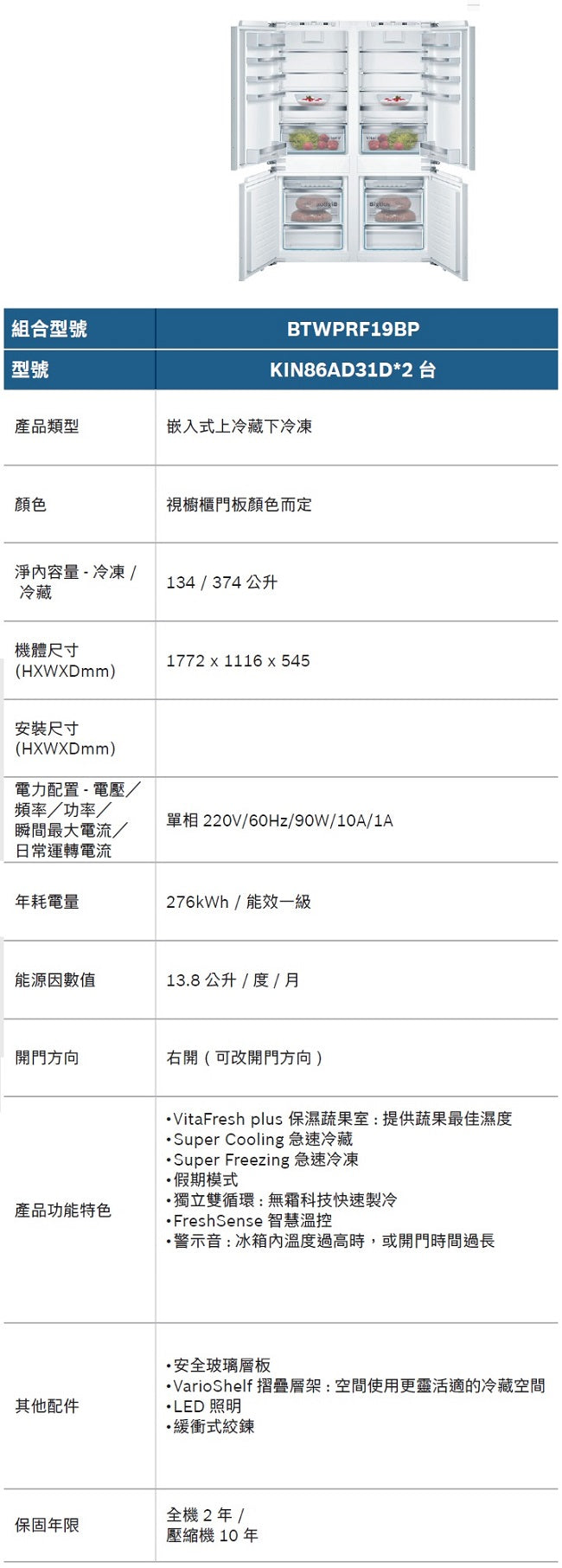 BOSCH博世|BTWPRF19BP 嵌入式雙門對開冰箱