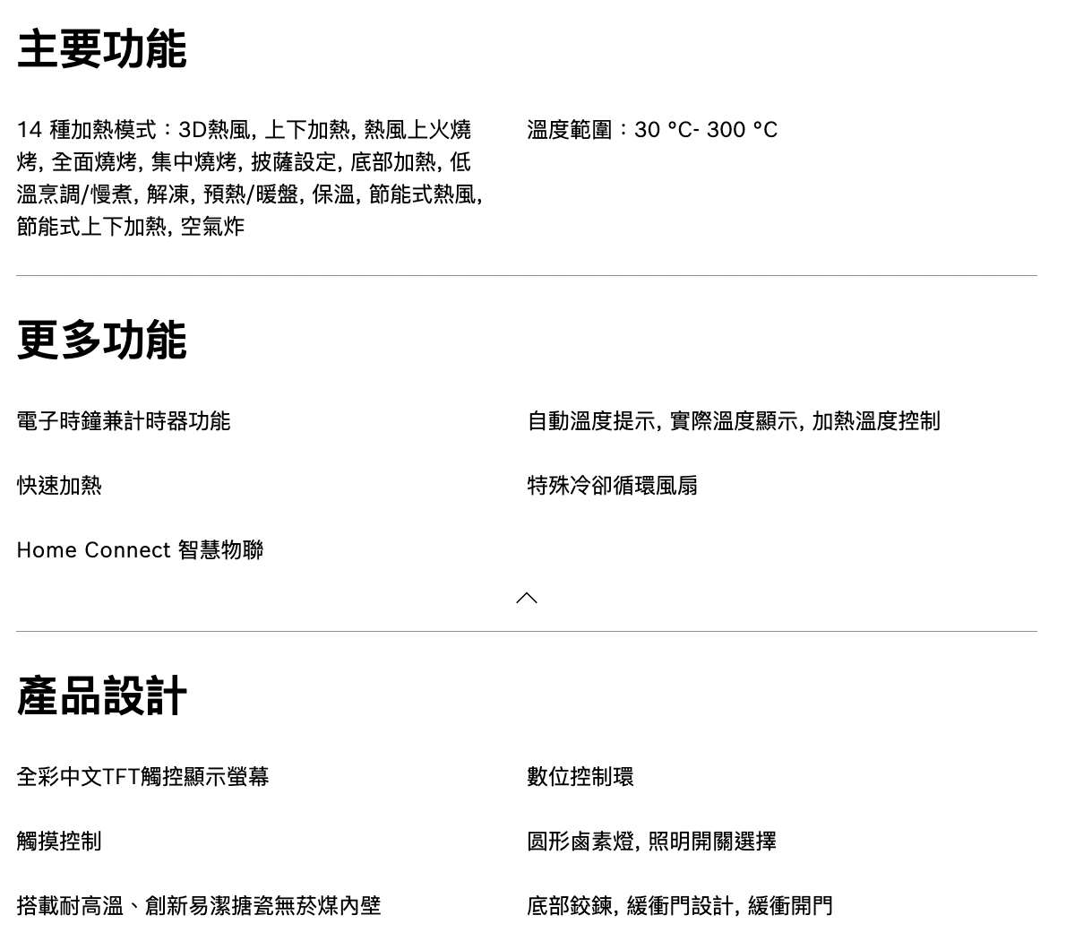 數位控制環:簡單而創新的烤箱設定的方式。 TFT Touch Display:得利於創新的數位控制環和 TFT 觸控螢幕,易於控制。 空氣炸功能:用於完美油炸的食物,如蔬菜和薯條。 節能式熱風:在烘烤和烘焙時節省能源。 節能式上下加熱:在烘烤和烘烤過程中節省能源。