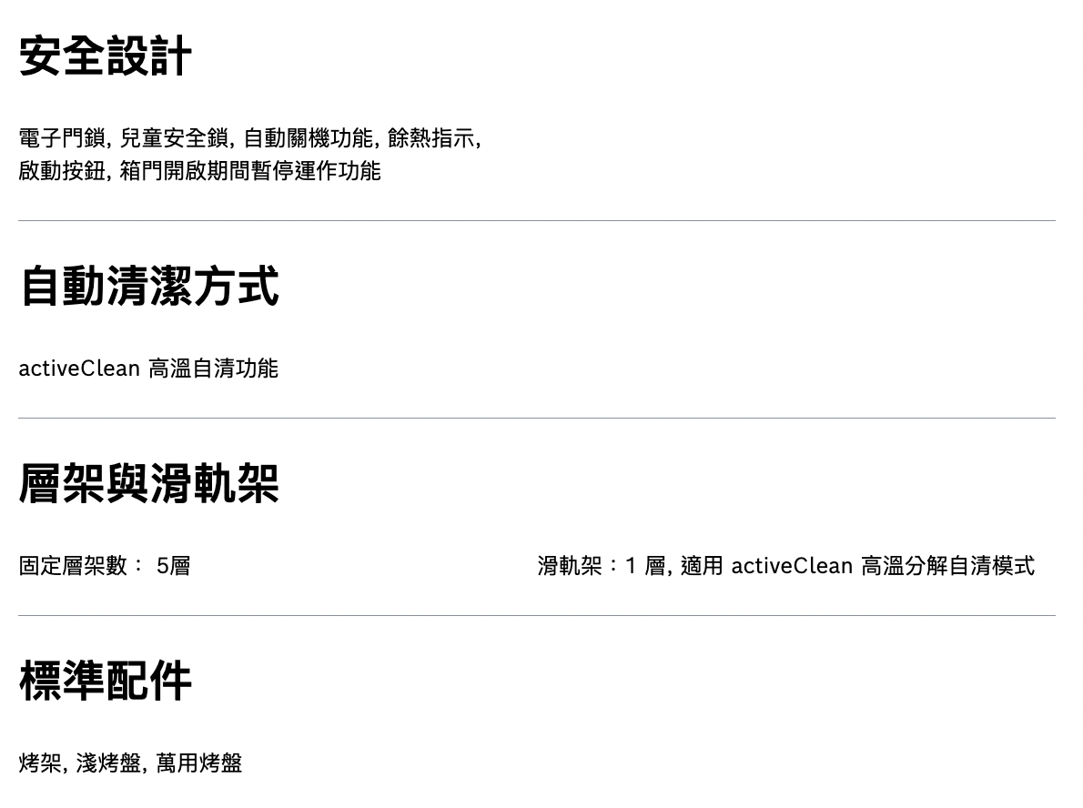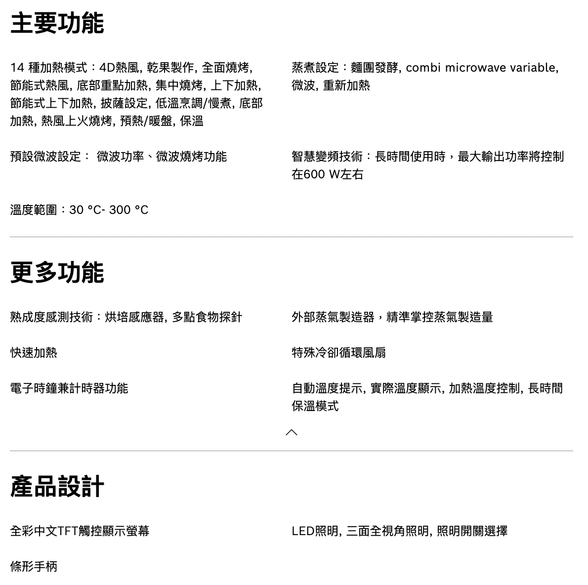 添加蒸氣烘焙:於燒烤或烘焙過程適度加入蒸氣,使餐點外皮酥脆且內餡多汁 微波功能:快速預熱或結合熱風快速烹飪 4D熱風:均勻的熱量分佈以獲得完美的結果——在任何層位上 全彩TFT觸控螢幕:清晰顯示文字和圖像,便於直覺地控制烤箱 Pyrolytic高溫分解自清潔:自動清潔烤箱,只需擦去灰燼