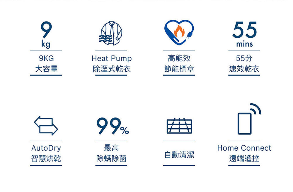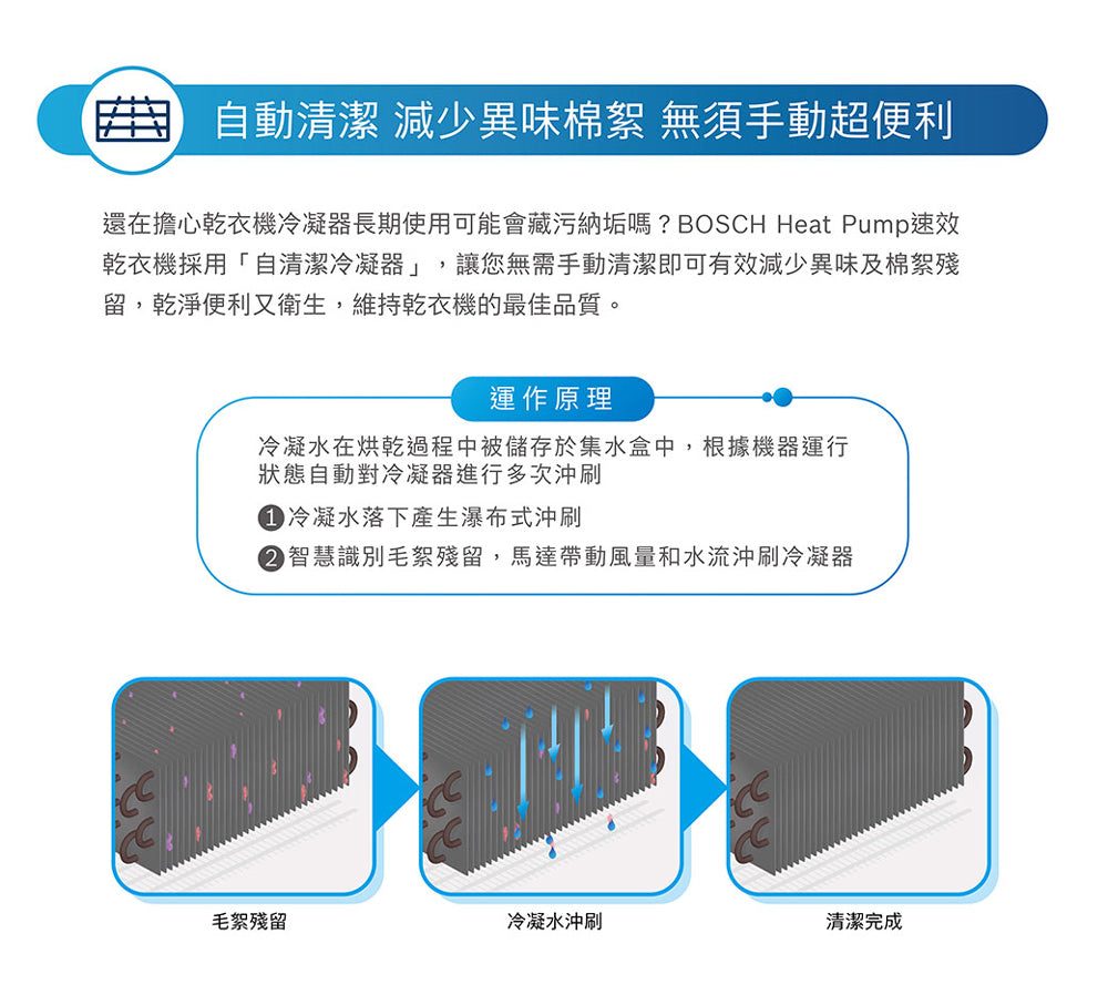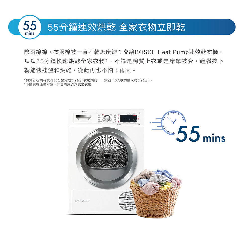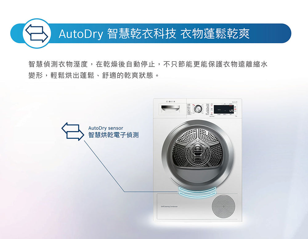 ● Heat Pump 除溼式乾衣科技:溫和更護衣 ● 自清潔冷凝器讓您無需於使用後手動清潔冷凝器棉絮。 ● AutoDry智慧烘乾科技:偵測衣物溼度,在達到所需乾燥程度後自動停止,節能護衣。 ● BOSCH Heat Pump 速效乾衣機取得國家節能標章,能效提升近2倍** 8系列 熱泵式乾衣機 9 kg