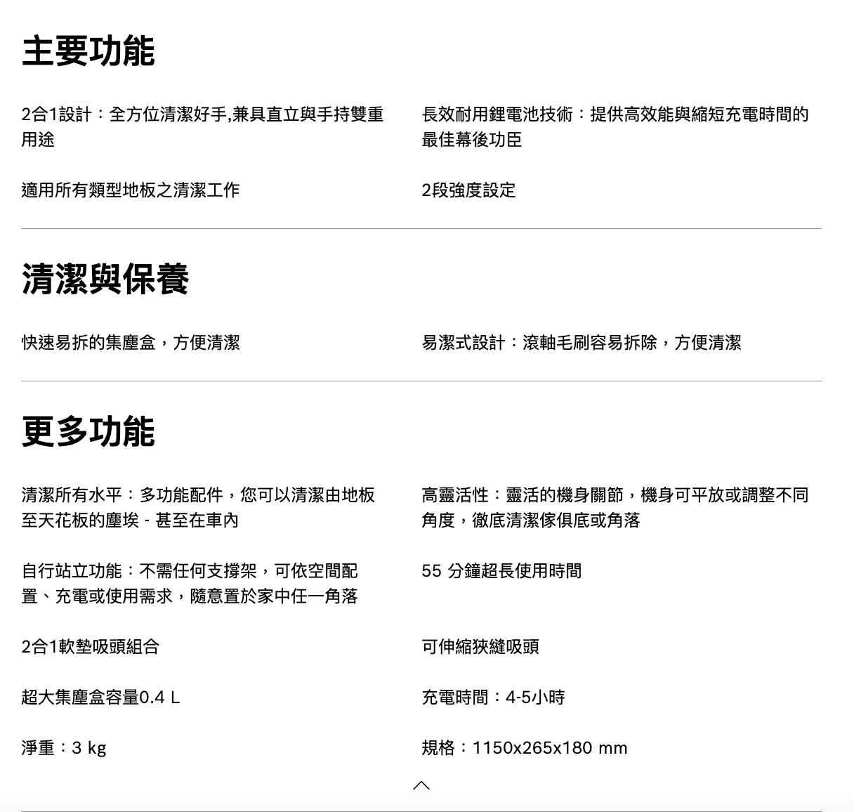 身藏多配件:配件組合可直接收納在吸塵器身中 全方位清潔:多個配件可清潔地板,天花板甚至汽車中的所有塵污 持續的高效,即使集塵盒裝滿,RobustAir系統也能提供高清潔性能。 超便利2合1設計:針對清潔需求,可當直立或手持吸塵器使用 對應於任何清潔任務:刷頭和手持設備的移動性極強,即使在家具下的地板亦可快速清潔
