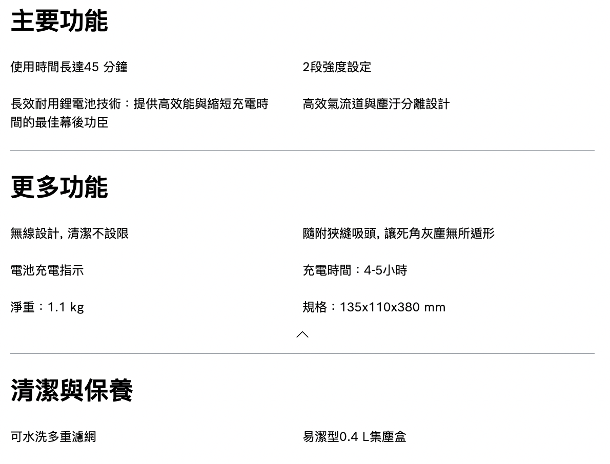 1.1kg輕巧重量 三重過濾系統&雙重可水洗濾網 居家汽車彈性運用;21.6V長效鋰電池,1.1kg輕巧重量