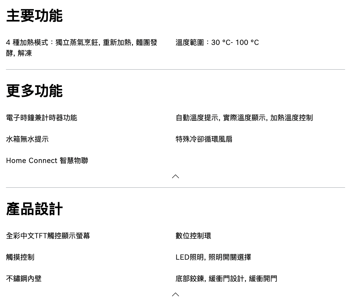 數位控制環:簡單而創新的烤箱設定的方式。 TFT Touch Display:得利於創新的數位控制環和 TFT 觸控螢幕,易於控制。 蒸煮功能:溫和及健康的烹調方式 自動關機:烹飪過程在菜餚完成後立即自動停止。 Home Connect 遠端控制和監控:發掘智慧烤箱的全部潛力。