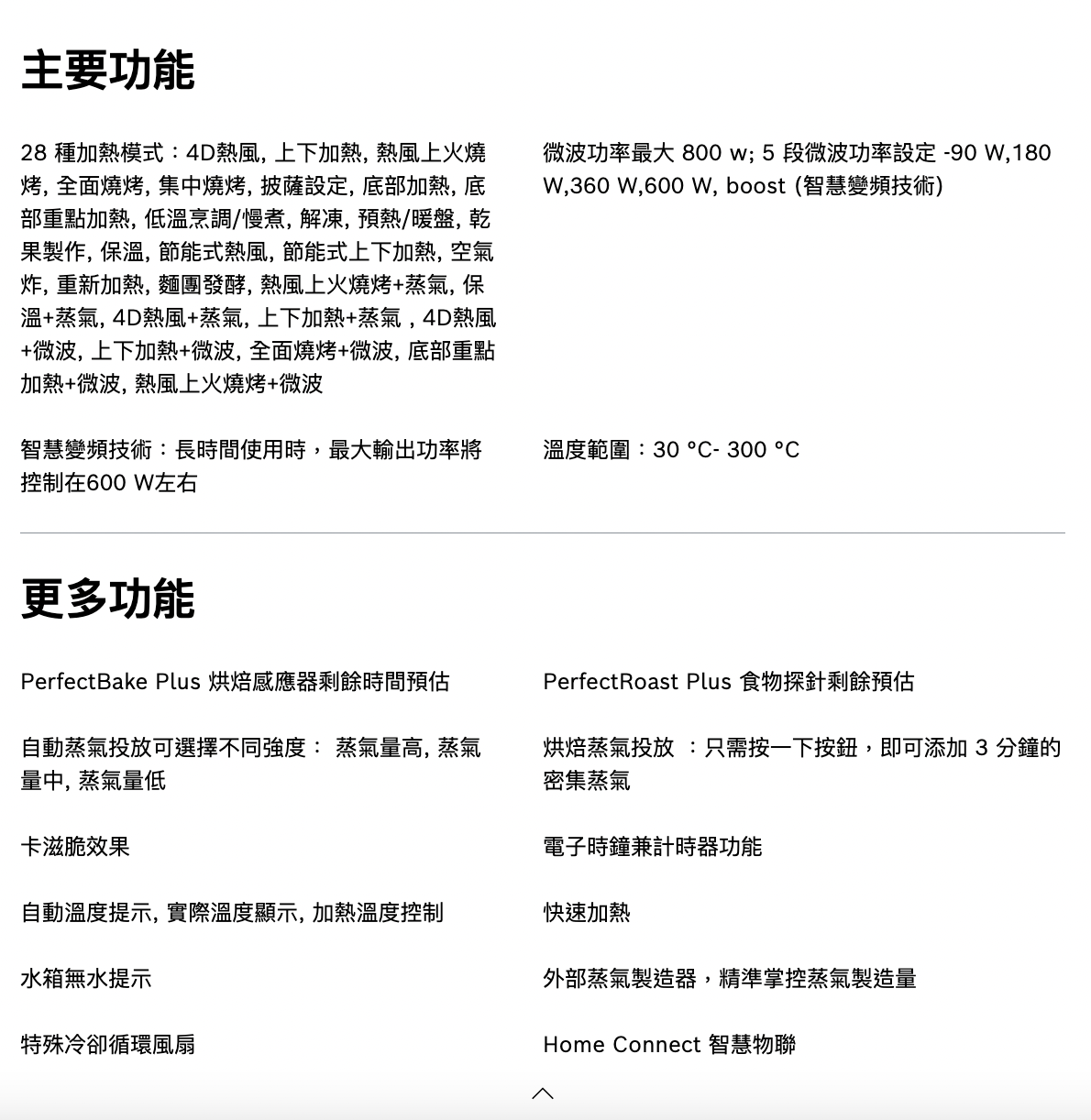 數位控制環:簡單而創新的烤箱設定的方式。 TFT Touch Display Pro:憑藉創新的數位控制環和全平面 TFT 觸控螢幕實現完美控制。 帶攝影機的烘焙調色盤:每次都能獲得完美的烘焙和烘烤效果。 PerfectRoast Plus AI智慧烤: 確切地知道您的烤肉何時完成。 PerfectBake Plus 甜點大師烤+:調節設置並準確告訴您何時從烤箱中取出餐點。