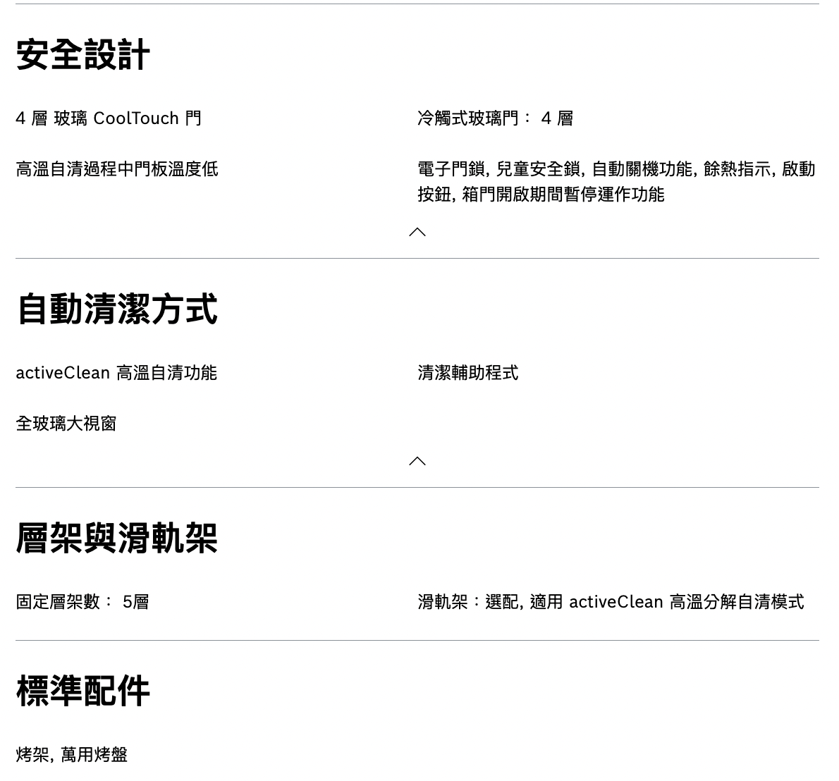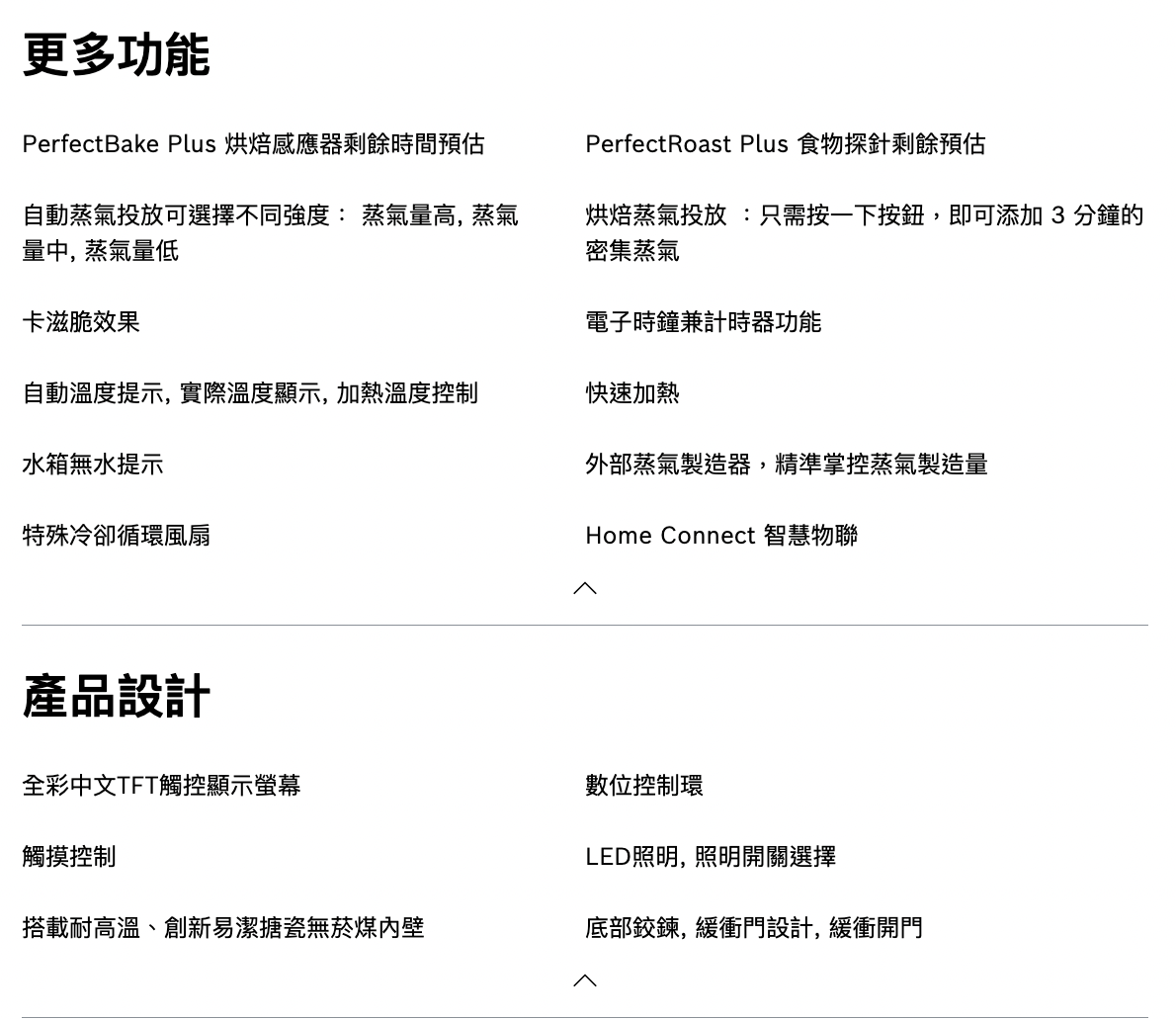 數位控制環:簡單而創新的烤箱設定的方式。 TFT Touch Display Plus:創新的數位控制環和加大的 TFT 觸控螢幕,易於控制。 PerfectRoast Plus AI智慧烤: 確切地知道您的烤肉何時完成。 PerfectBake Plus 甜點大師烤+:調節設置並準確告訴您何時從烤箱中取出餐點。 Steam Boost 烘焙蒸氣投放:通過單獨的蒸氣投放烘烤您自己的香脆麵包。