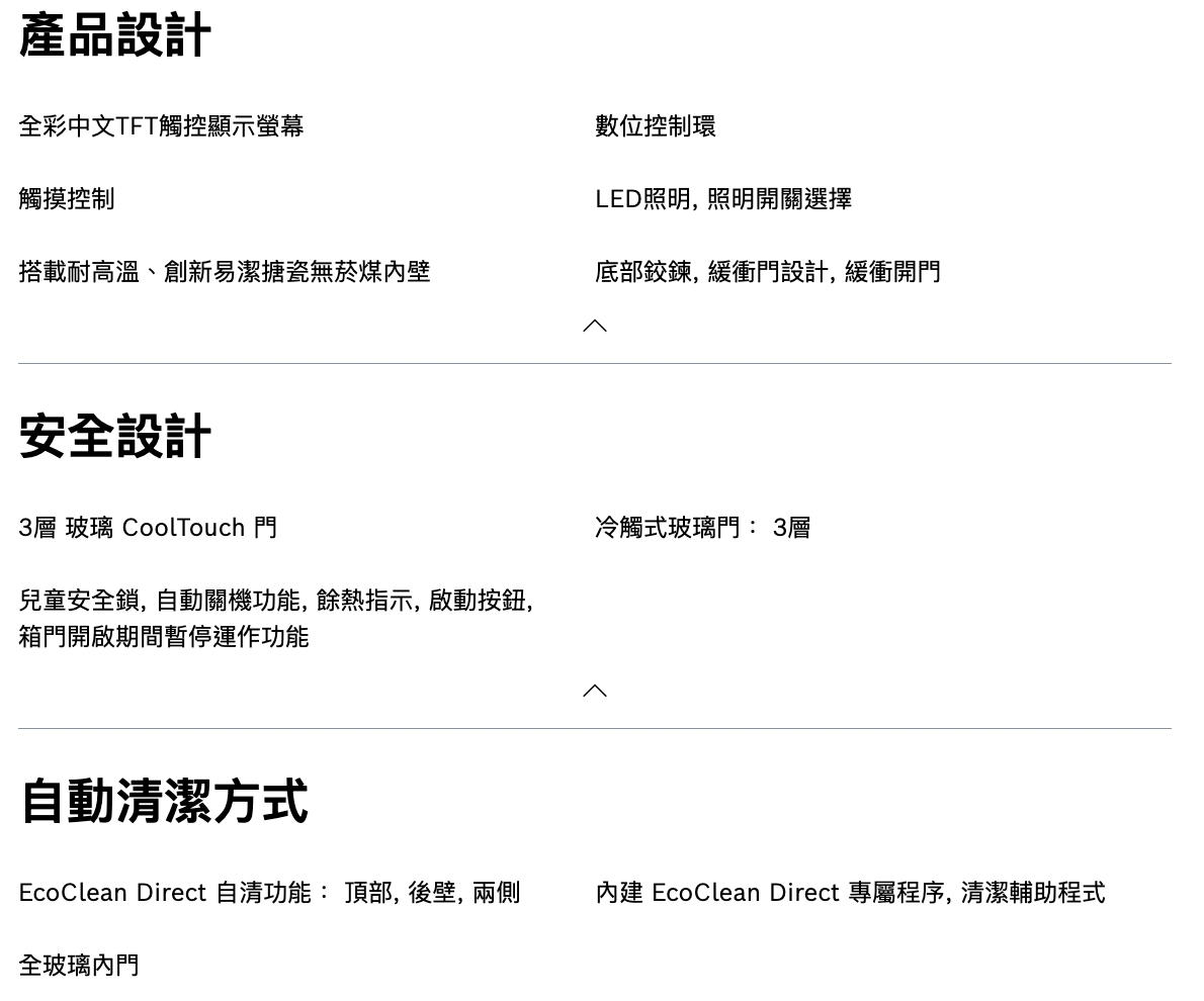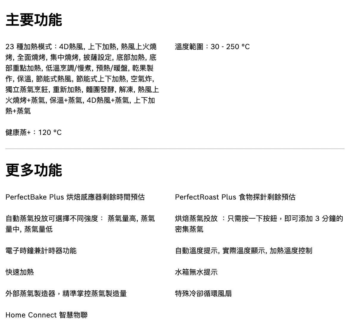 數位控制環:簡單而創新的烤箱設定的方式。 TFT Touch Display Pro:憑藉創新的數位控制環和全平面 TFT 觸控螢幕實現完美控制。 PerfectSteam 恒氧蒸氣調控技術:蔬菜、魚和肉烹調至完美 健康蒸+:在高達 120°C 的溫度下製備溫和、健康的食物。 Steam Boost 烘焙蒸氣投放:通過單獨的蒸氣投放烘烤您自己的香脆麵包。