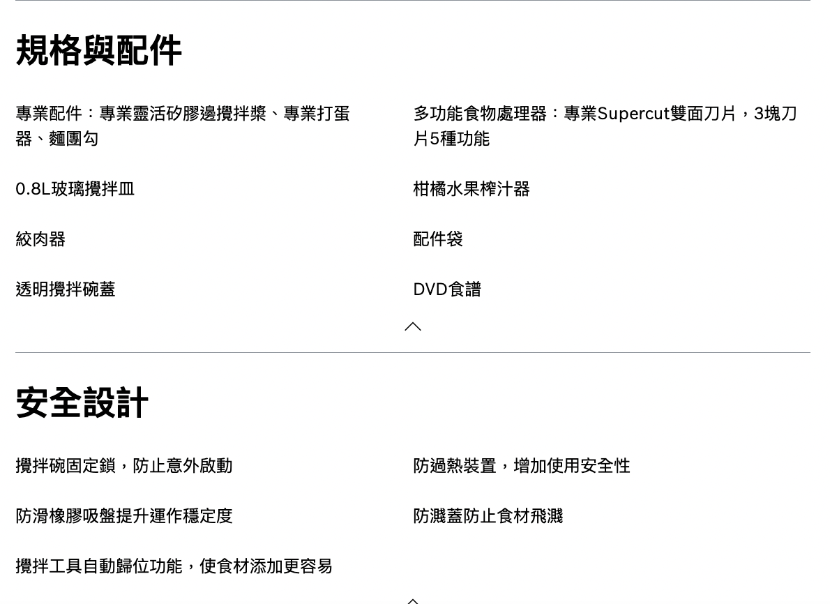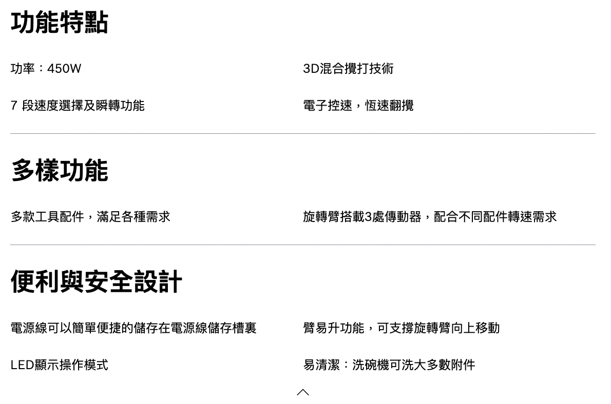 7種轉速設定:通過7種速度設定和瞬轉功能,輕鬆快速地進行烹調 攪拌工具自動歸位功能,使食材添加更容易 臂易升多功能活動旋轉臂能自由上下調動,旋轉臂上的三個配件接口,可接駁不同配件使用 易於清潔:大多數附件適用於洗碗機 安全裝置:各式保護裝置提供最大的安全性