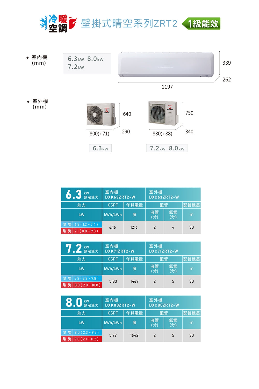 MITSUBISHI 三菱重工 |10-11坪ZRT2系列變頻冷暖分離式空調(DXC63ZRT2-W/DXK63ZRT2-W)