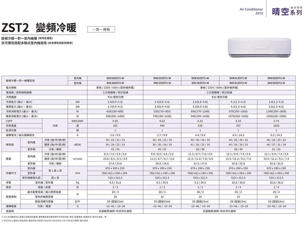 【室外機:DXC50ZSXT2-W 】 尺寸(mm):寬800×高640×深290mm 配管尺寸 : 2/3 電源:單相 220V 60Hz CSPF省電1級 【室外機:DXK50ZSXT2-W】 尺寸(mm):寬920×高305×深220(mm)