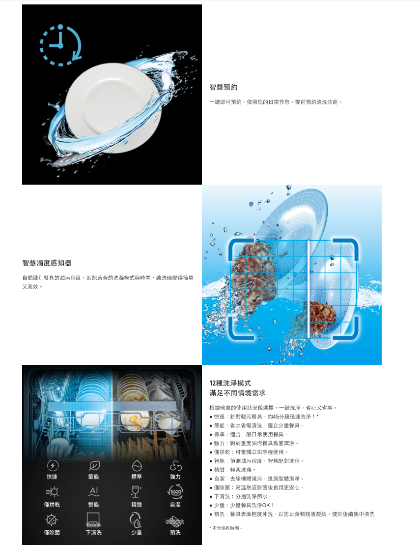 去殘水功能、濁度感知(智能洗)、軟化鹽/光潔劑不足顯示、獨立烘乾、預約功能(1~24hr)、濾網自體淨、地面投影