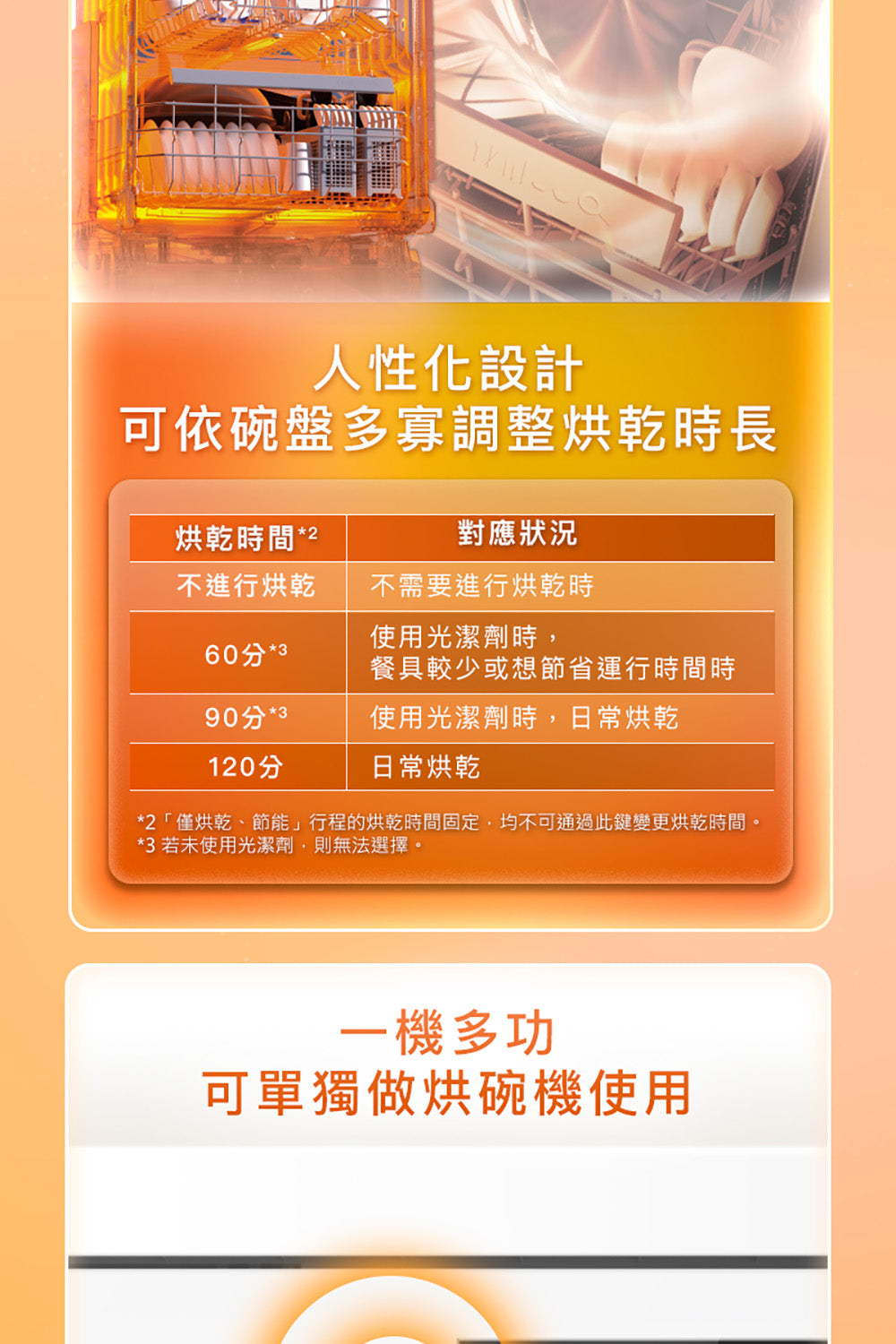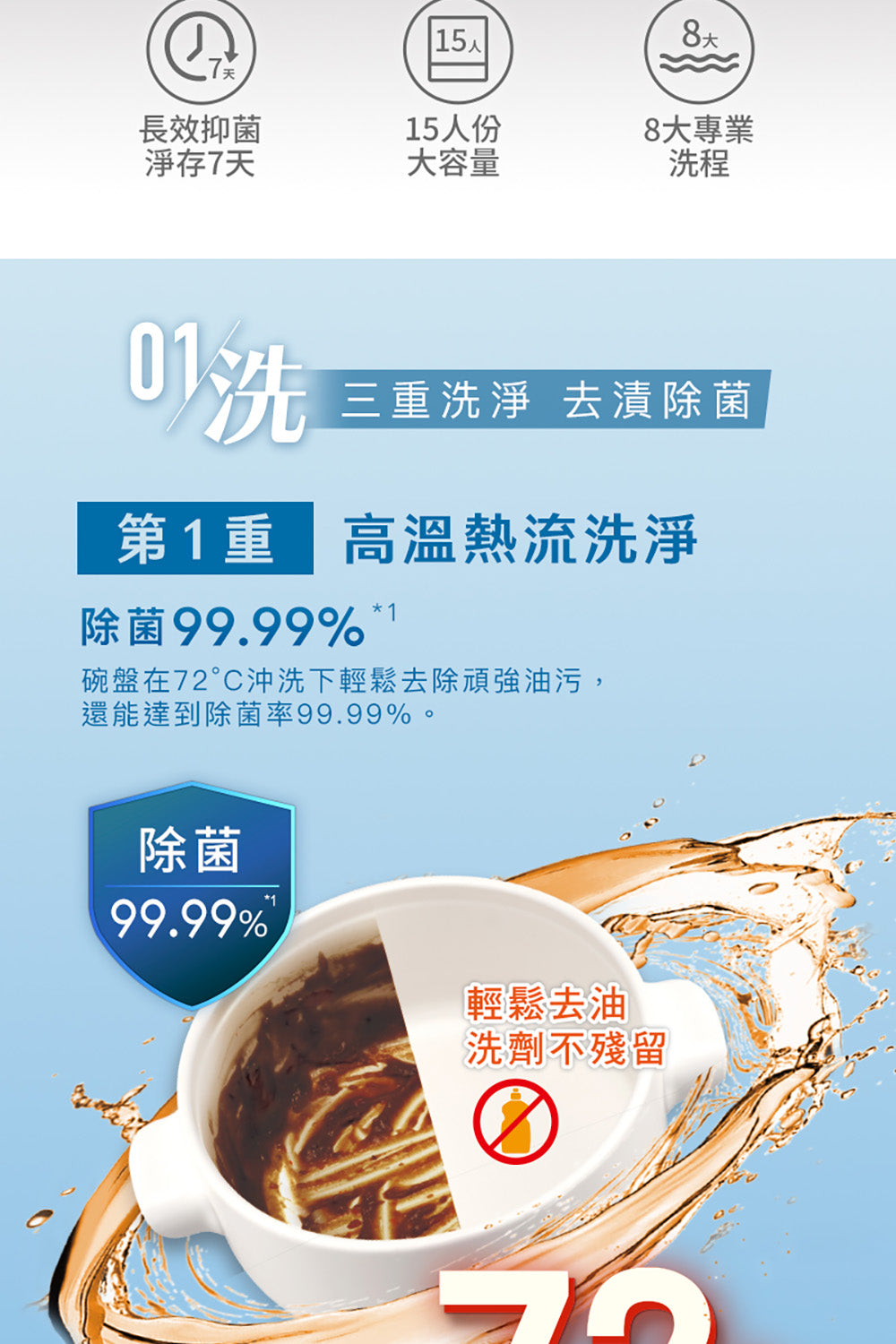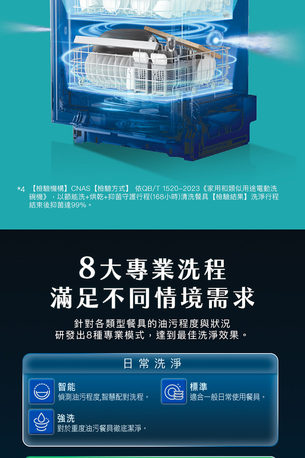 *4 【檢驗機構】CNAS【檢驗方式】依QB/T 1520-2023《家用和類似用途電動洗碗機》,以節能洗+烘乾+抑菌守護行程(168小時)清洗餐具【檢驗結果】洗淨行程結束後抑菌達99%。