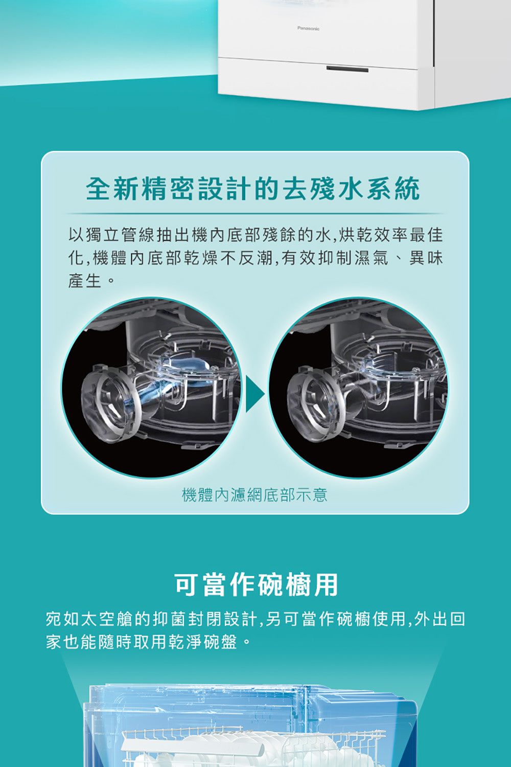 *1 【檢驗機構】台灣SGS【檢驗方式】取100uL的菌液(約10⁷CFU/mL)於餐具上,使得餐具上約有10⁶CFU,並放至NP-DFB2K6-1H洗碗機指定位置後進行標準洗,以10mL PBS沖洗萃取並取1mL稀釋後各稀釋液取1mL加入培養皿並倒入15-20mLTSA混合均勻待凝固後,培養約30-35℃ 3天後觀察並計數菌數。【檢驗結果】洗淨行程結束後金黃色葡萄球菌及大腸桿菌除菌率達99.99%。