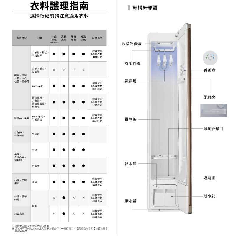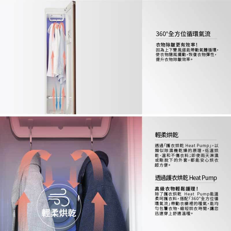 雙重除菌 蒸氣+UV紫外線 去味除臭 透過高溫蒸氣包覆異味分子 香薰選擇添加 Heat Pump輕柔烘乾 全方位循環氣流 蒸氣除皺 擺放位置 後方+10cm以上散熱空間