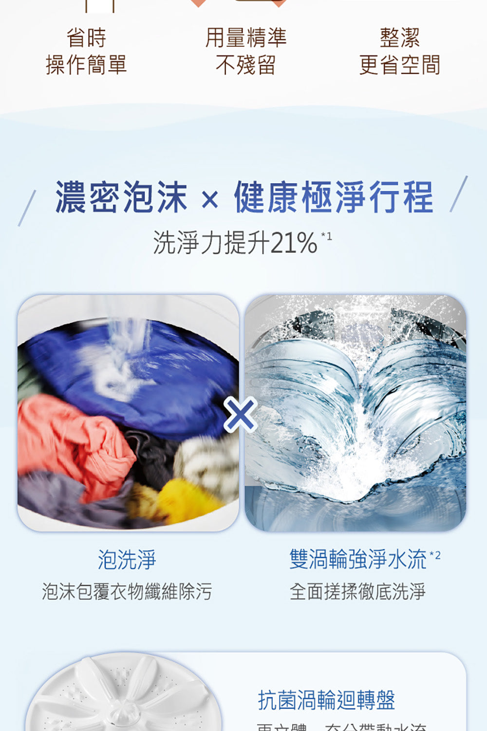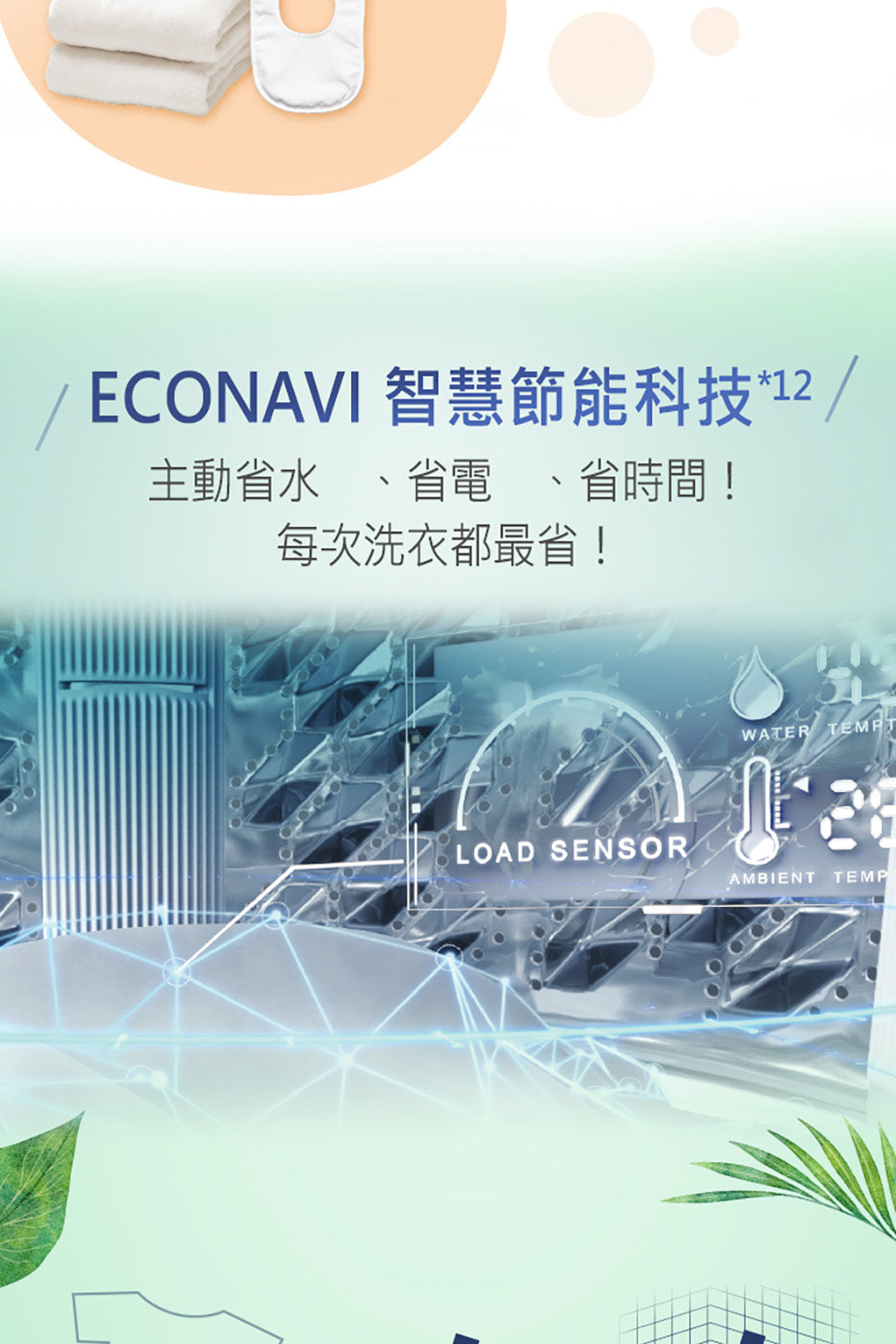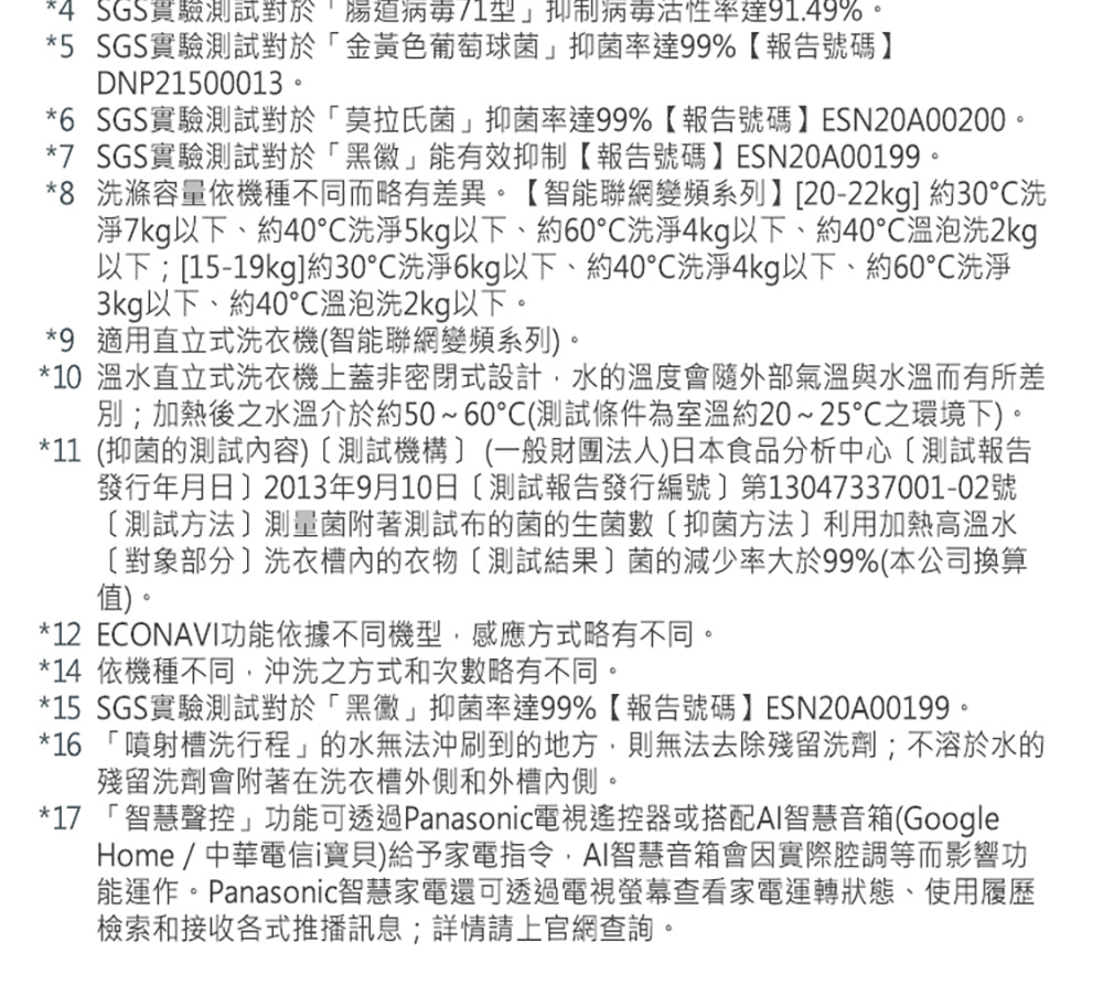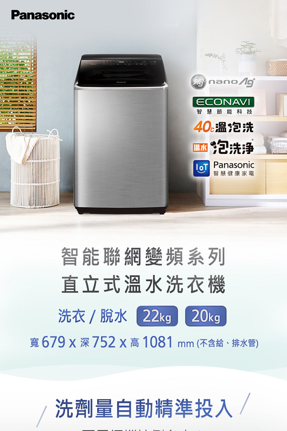 • 洗衣/脫水 20kg • 洗劑量自動精準投入 • nanoAg抗菌銀離子 • 雙渦輪強淨水流 • 抗菌渦輪迴轉盤 • 溫水泡洗淨 • ECONAVI智慧節能科技 • 雙效自動槽洗淨 • IoT智慧健康家電