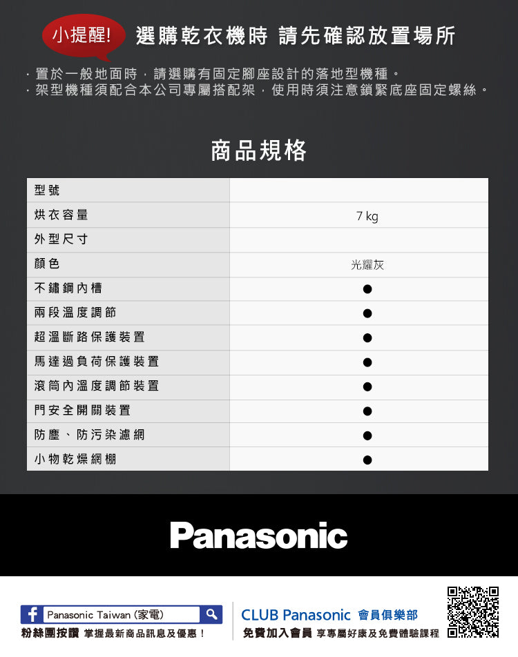 Panasonic 國際牌|NH-70G 7公斤落地型乾衣機