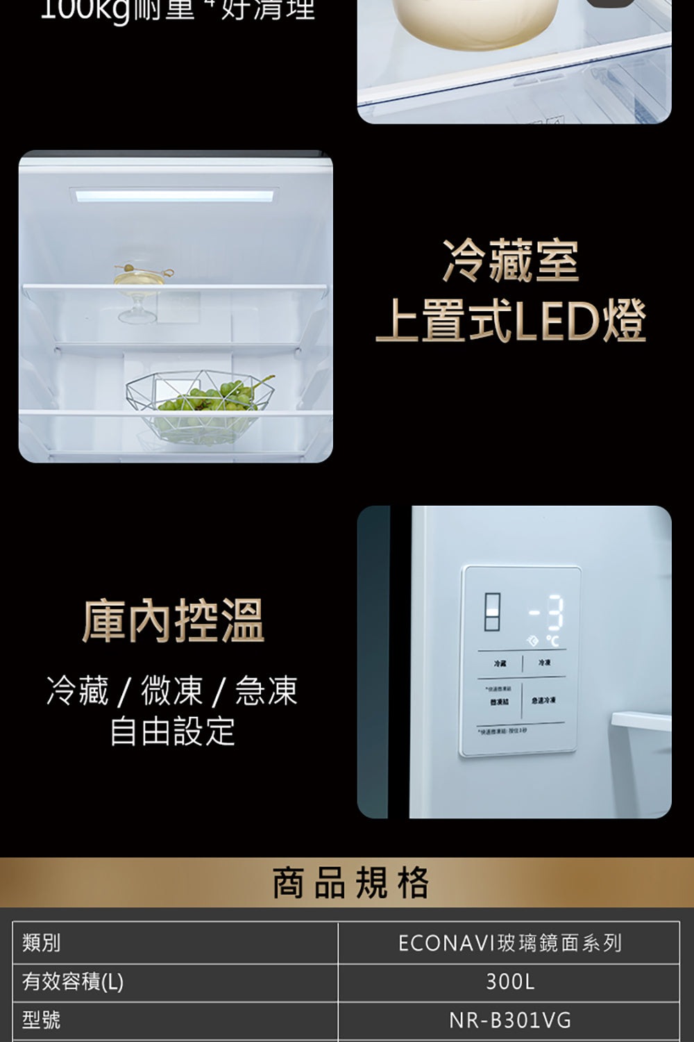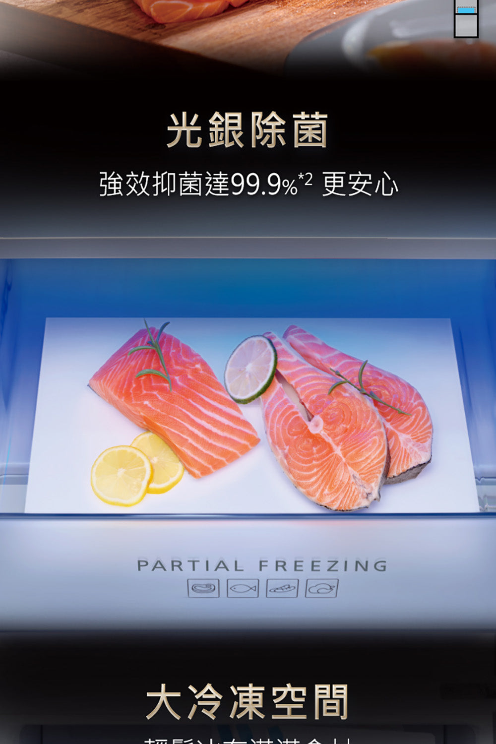 ● 有效容積300L ● 上冷藏下冷凍 ● -3°C微凍結 ● 光銀除菌 ● Ag銀抑菌 ● 冷凍大空間 ● ECONAVI智慧節能科技 ● 新1級能源效率