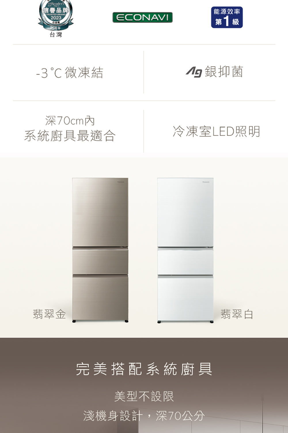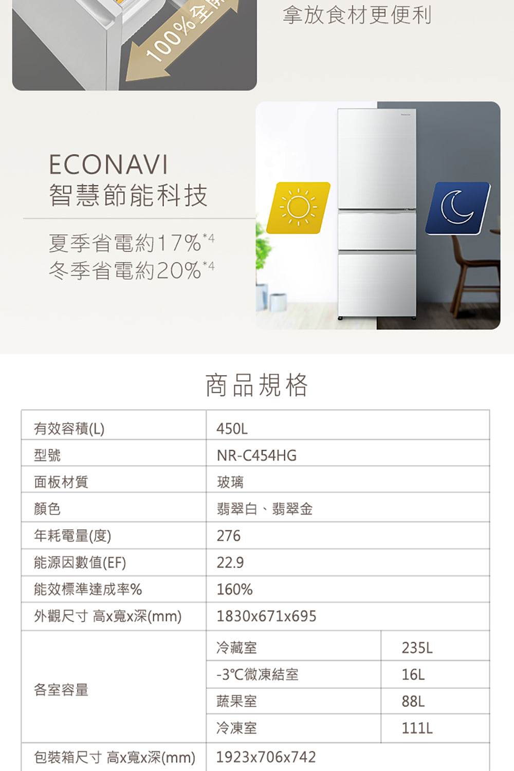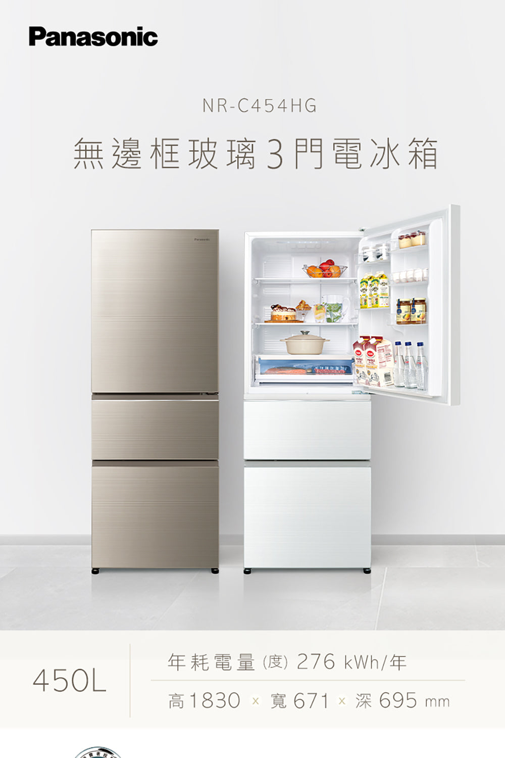 Panasonic 國際牌|NR-C454HG 450L新一級能效三門玻璃門變頻冰箱(翡翠白/翡翠金)