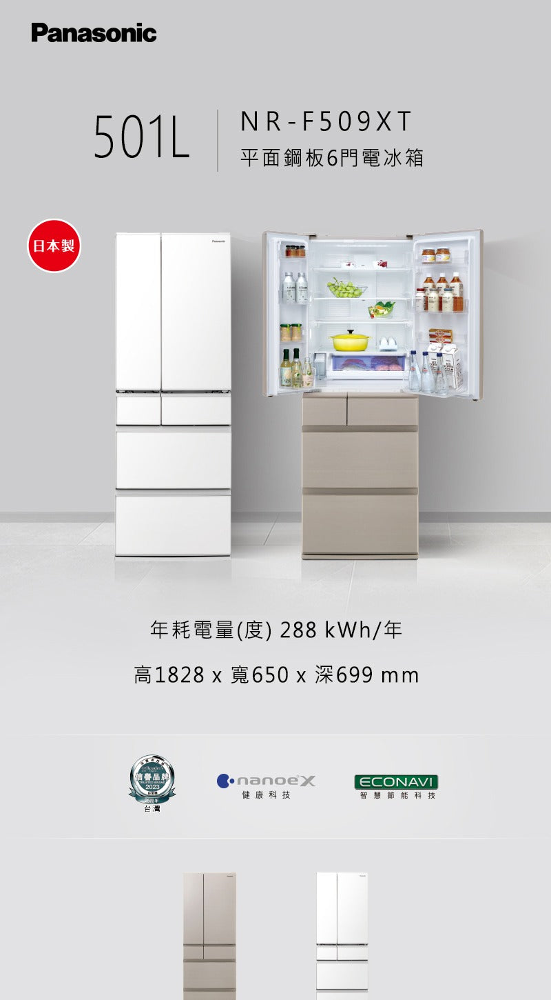 Panasonic 國際牌|NR-F509XT 501L日本製一級能效六門變頻冰箱(香檳金/晶鑽白)