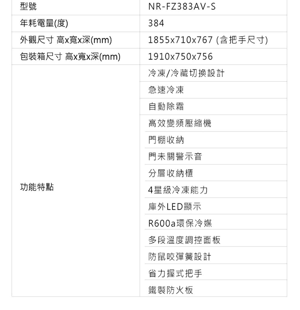 Panasonic 國際牌|NR-FZ383AV-S 380L高效變頻壓縮機直立式冷凍櫃