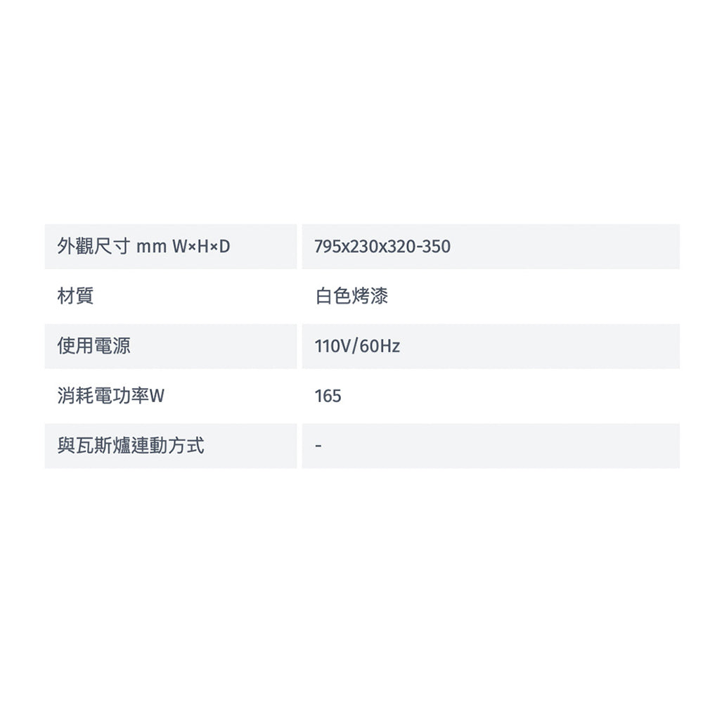 全隱藏式油機 專利智慧型全自動電熱除油 抽拉式強化玻璃導煙板 專利滑蓋啟動,掀蓋輕巧變速 首創LED藍光投射導煙板 雙渦輪設計,吸力佳 LED燈 材質:白色烤漆