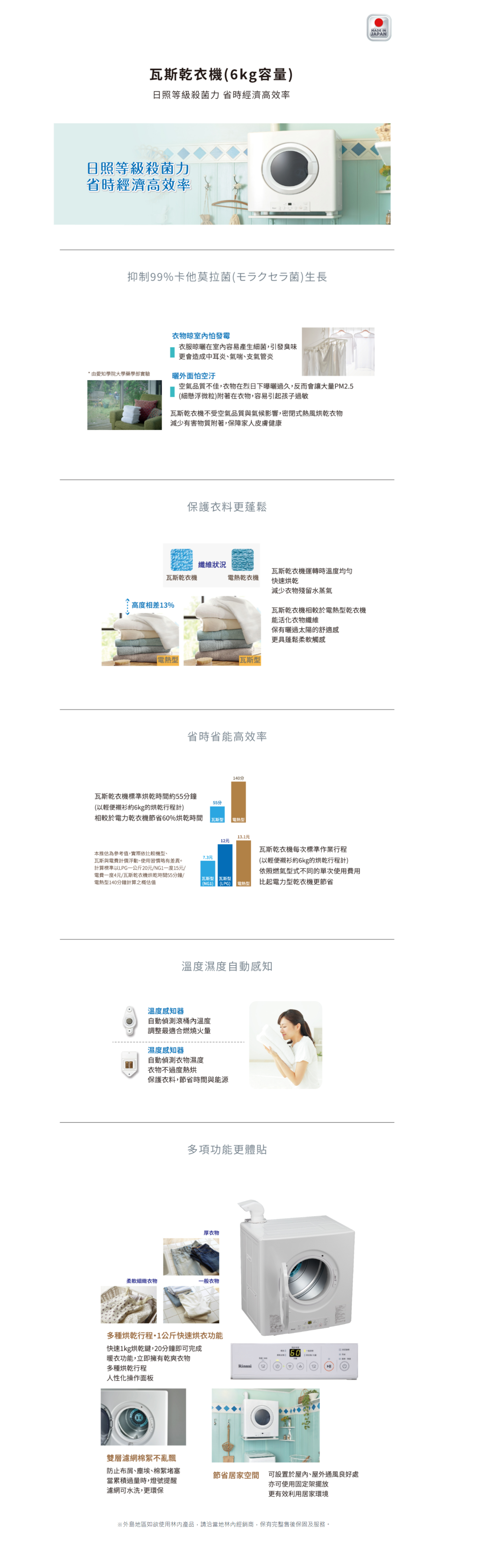 *6kg容量 *標準烘乾時間55-60分鐘,適合小家庭使用 *快速烘乾功能 *1kg衣物烘乾時間20分鐘立即乾爽 *暖衣功能,快速乾燥衣物上的剩餘濕氣 *柔軟衣物專用的細緻衣物程序