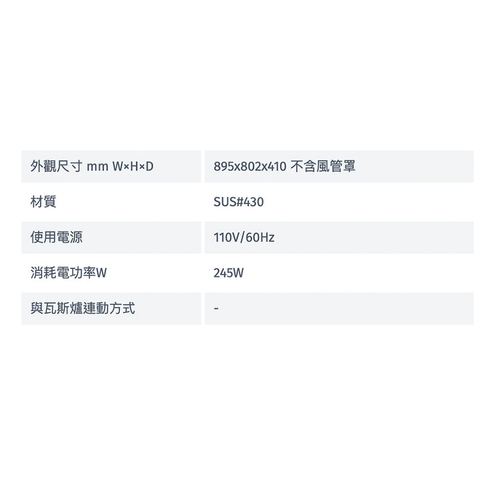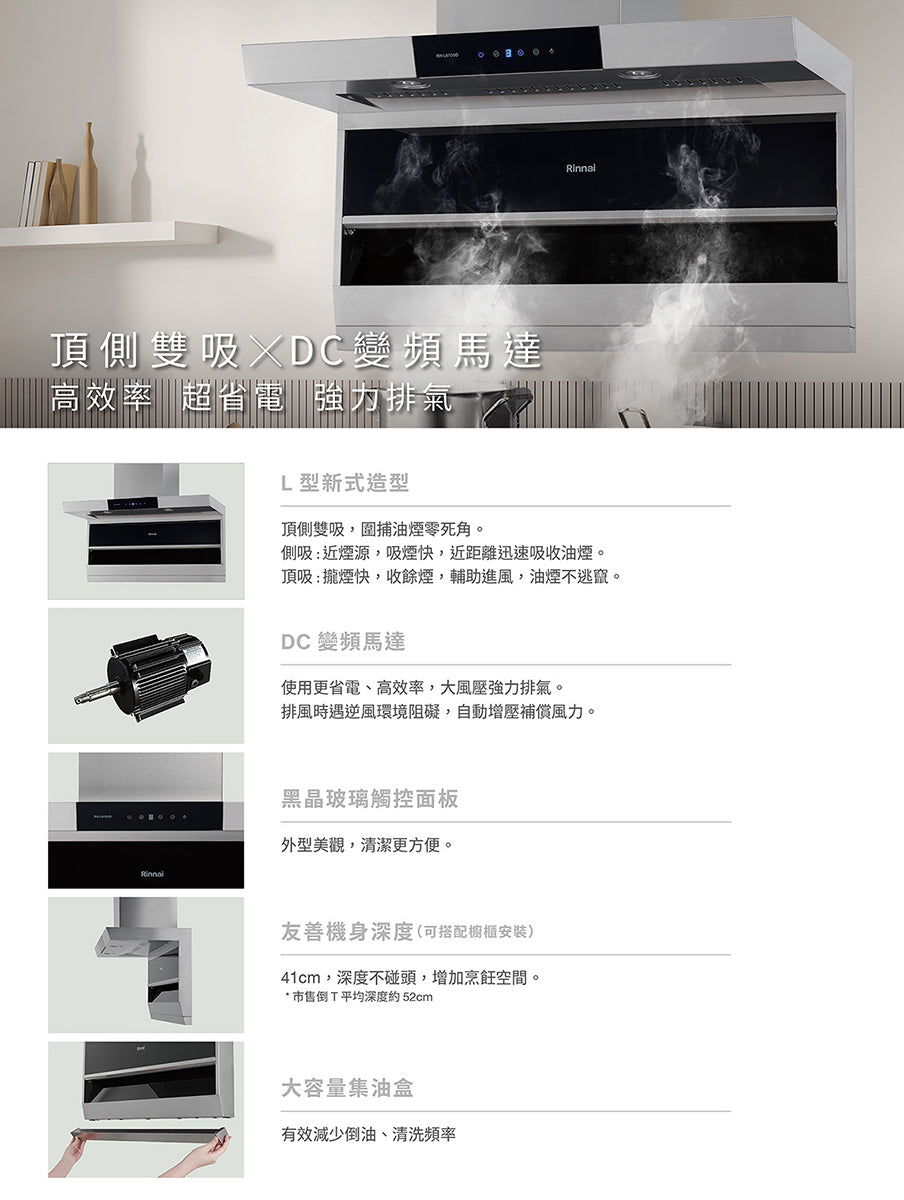 L型新式造型 側吸:近煙源,吸煙快,近距離吸收油煙 頂吸:攏煙快,收餘煙,輔助進風油煙不逃竄 DC變頻馬達 黑晶玻璃觸控面板 41cm友善機身深度 大容量集油盒 *本機標