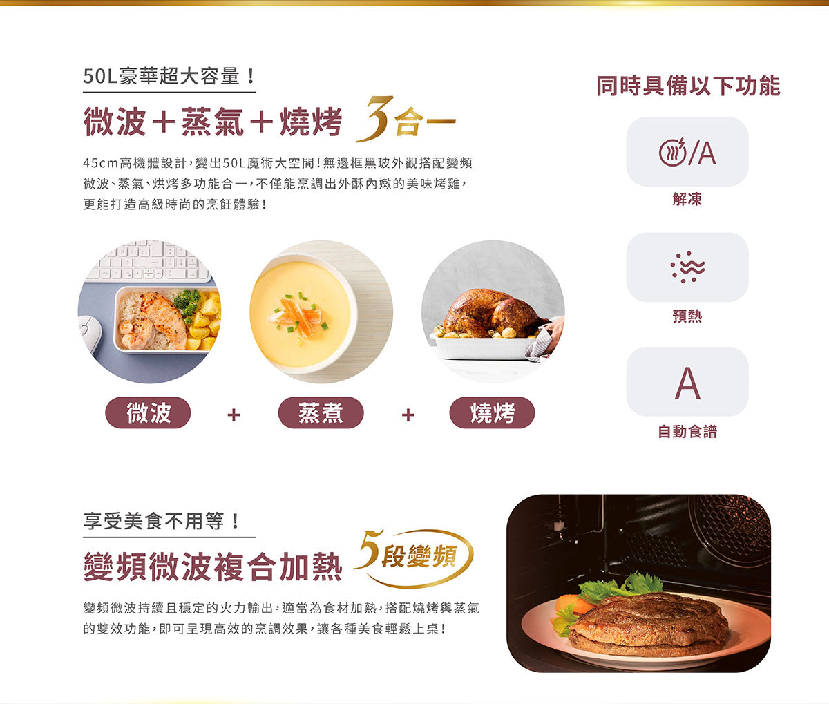 ▪ 「微波+蒸氣+燒烤」三強合一,多種烹調功能設定,打造高級時尚烹飪體驗