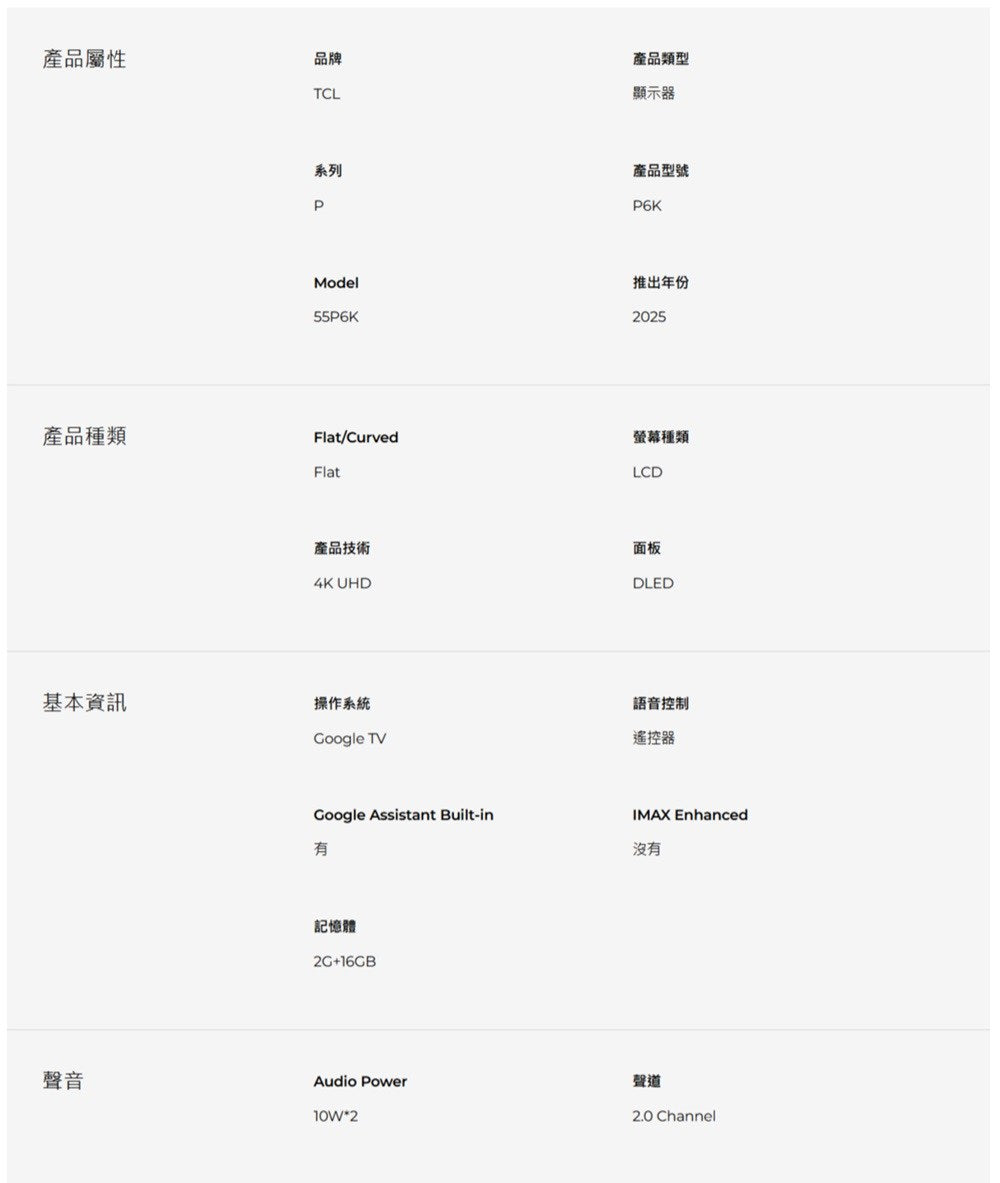 TCL| 55吋 4K Google TV 智慧連網液晶顯示器 55P6K