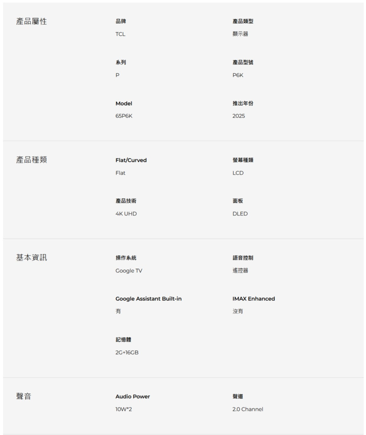 TCL| 65吋 4K Google TV 智慧連網液晶顯示器 65P6K