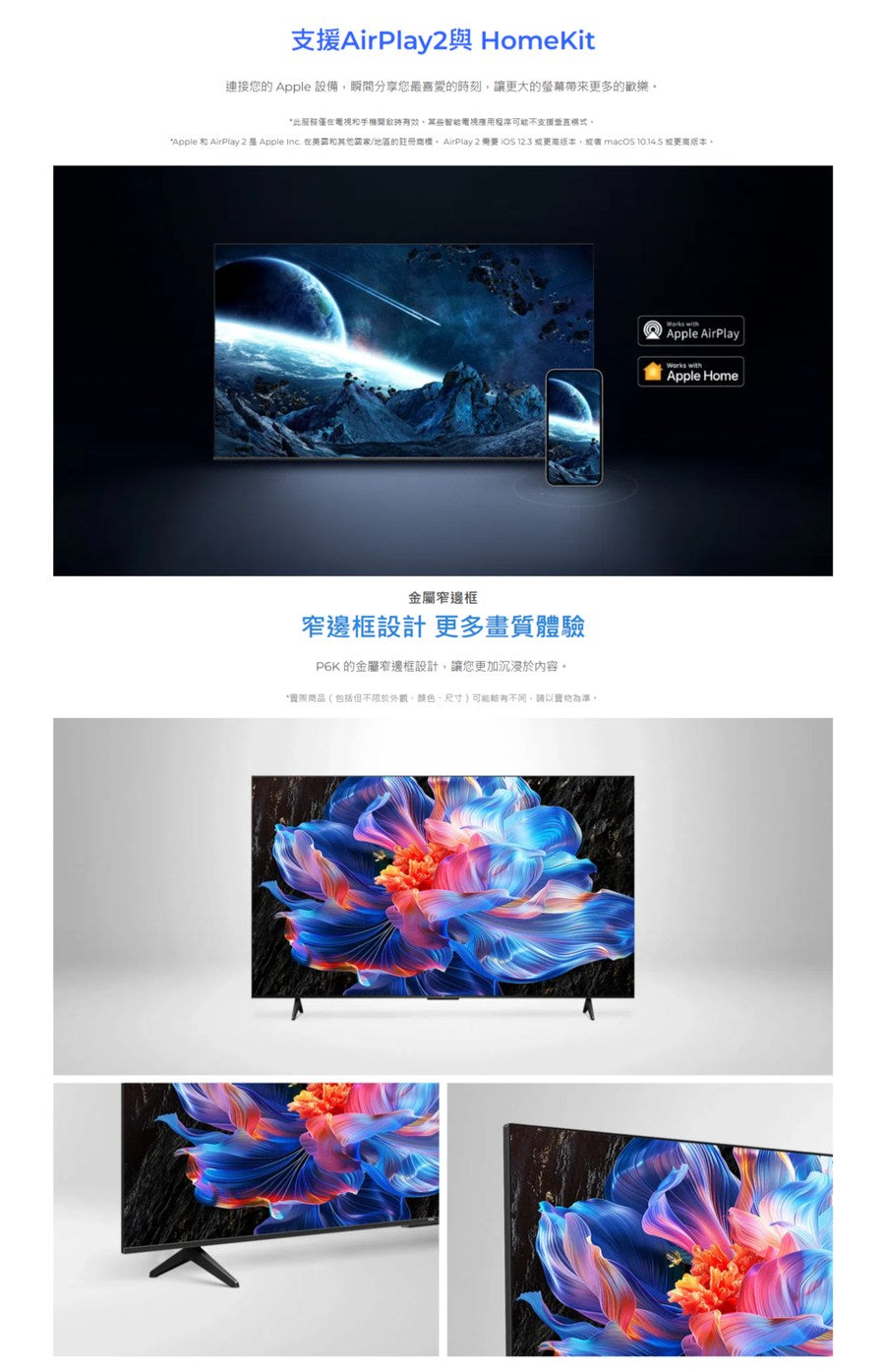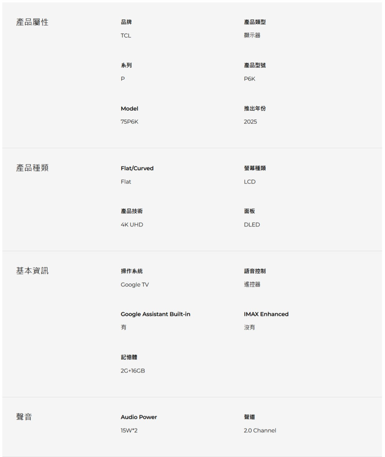 TCL| 75吋 4K Google TV 智慧連網液晶顯示器 75P6K