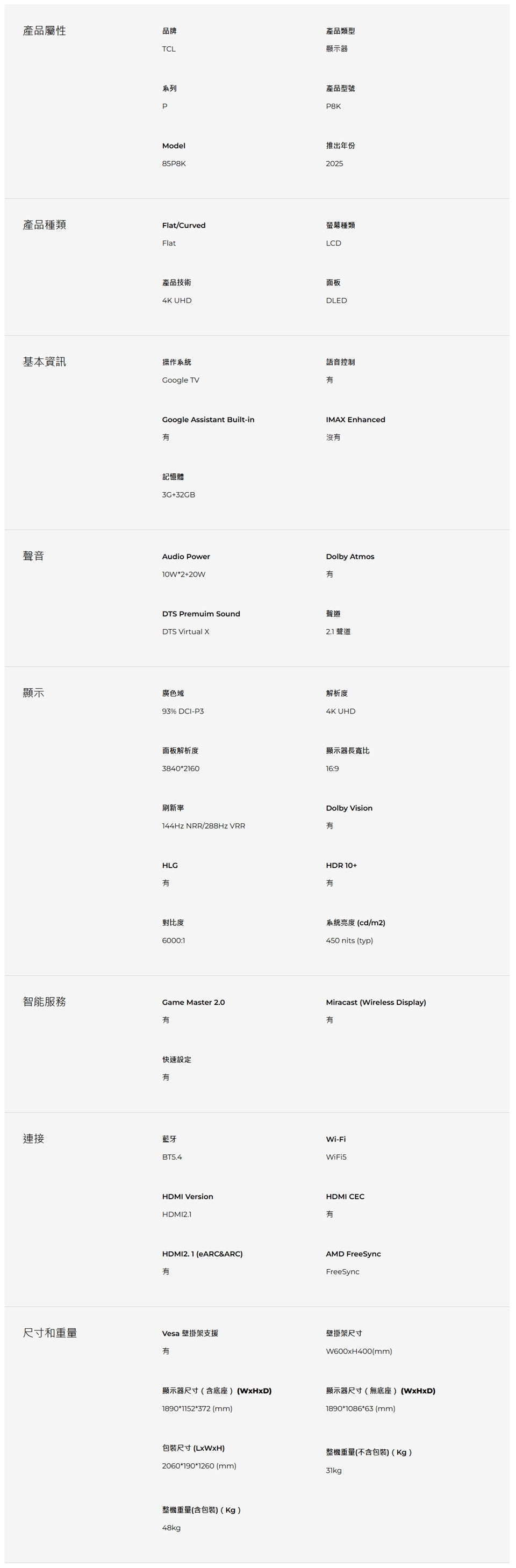 TCL|85吋 P8K QLED Google TV 量子智能連網液晶顯示器 85P8K
