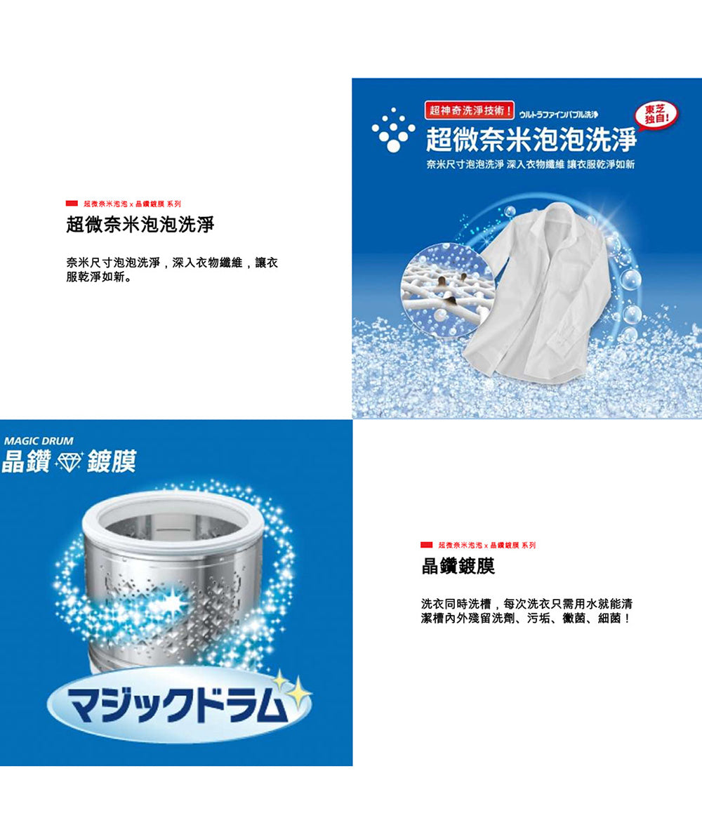 東芝旗艦獨家,超神奇洗淨技術,奈米尺寸泡泡深入衣物纖維,有效減少衣物汗漬、皮脂、黃斑殘留! 晶鑽鍍膜洗衣同時洗槽,每次洗衣只需用水就能清潔槽內外殘留洗劑、污垢、黴菌、細菌,帶給全家人更好的潔淨體驗!