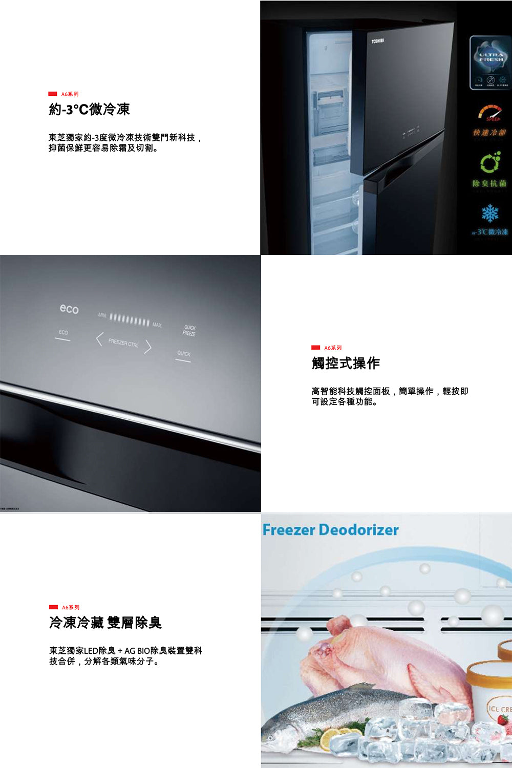 東芝雙門冰箱獨家採用,約-3°C 微冷凍功能,始肉品微凍結,一週內都能保持新鮮狀態! 料理時更容易切割除霜!