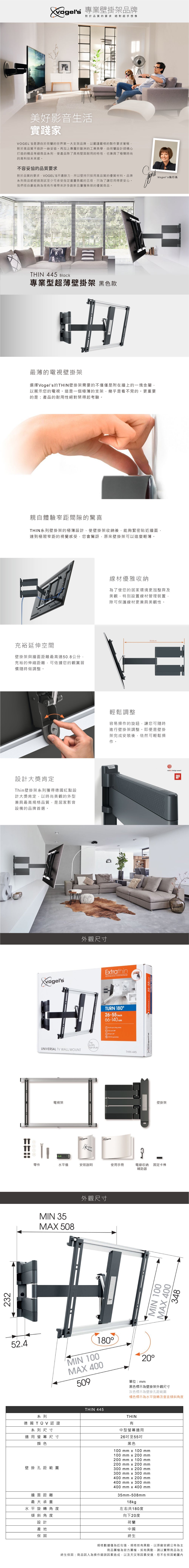 Vogel's|THIN 445 26-55吋 超薄型 可傾斜 單臂式 壁掛架 (黑色) 3.5cm-50.8cm