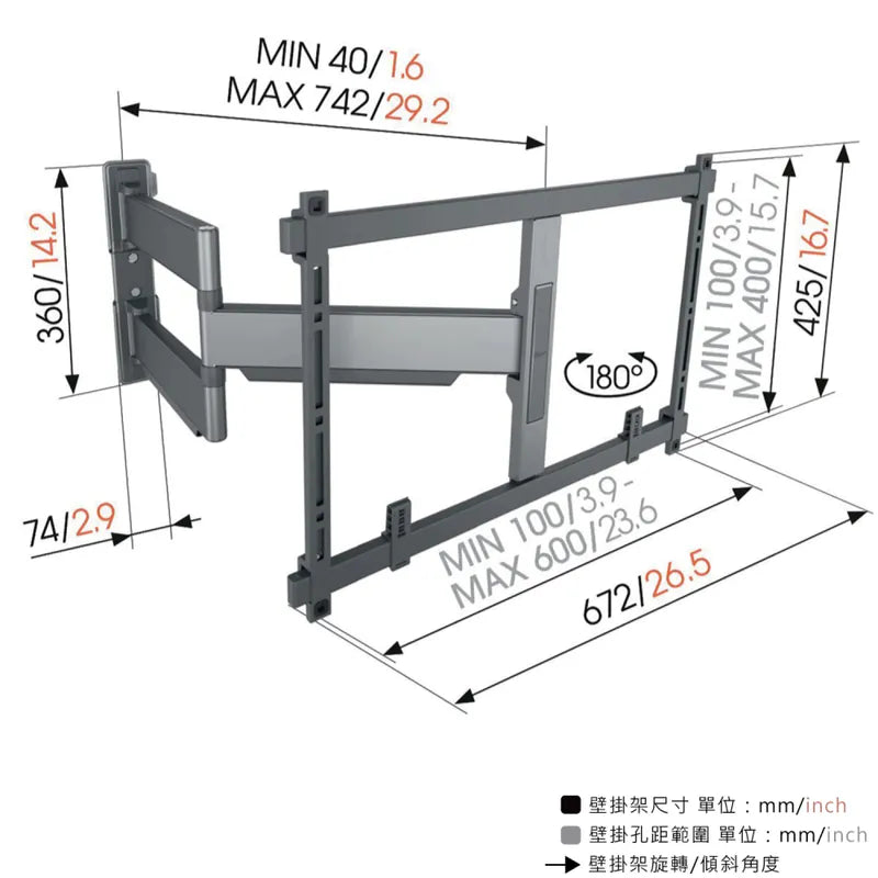 Vogel's| TVM 5845 55-100吋適用 單臂式伸縮壁掛架 黑色 OLED QLED適用